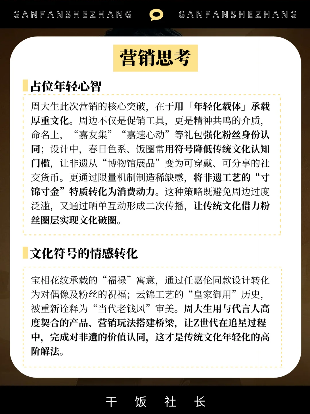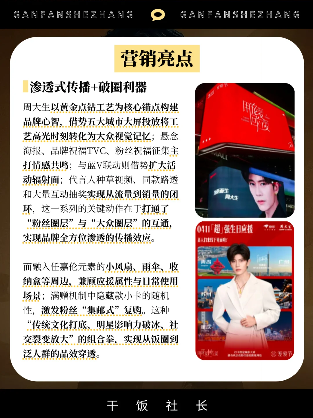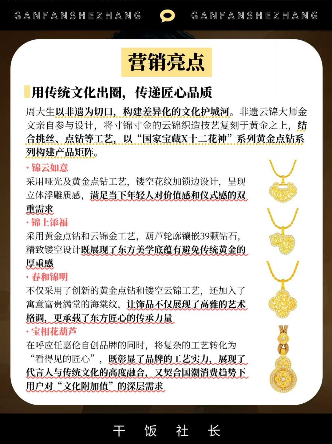碎片化环境,明星营销有必要升级玩法 在明星的选择上,一定要和品牌的的调性相契合 同时在传播中以明星为核心,不断触达外层受众 只有将明星影响力真正转化为品牌传播力 才能真正为自身品牌创造品效口碑 近期,周大生携手代言人任嘉伦🌟 在今年411宠爱节发起的一场营销战役 不仅撬动传统文化与年轻群体的深度对话 通过非遗强化了周大生黄金点钻工艺心智 实现国家宝藏x十二花神黄金点钻的种草裂变 一起来看下周大生是如何将产品与代言人结合 并通过传统文化完成一场教科书级的营销范例