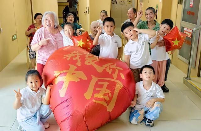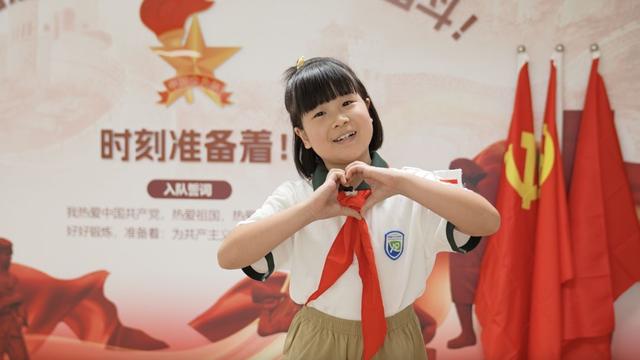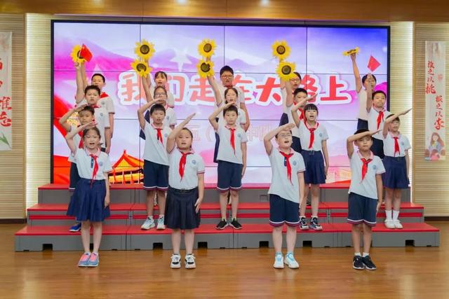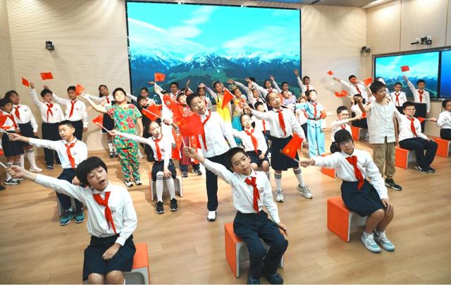 新普陀小学东校的学生挥舞着手中的五星红旗,精神饱满地用清澈响亮的童声传递着真挚的祝福。