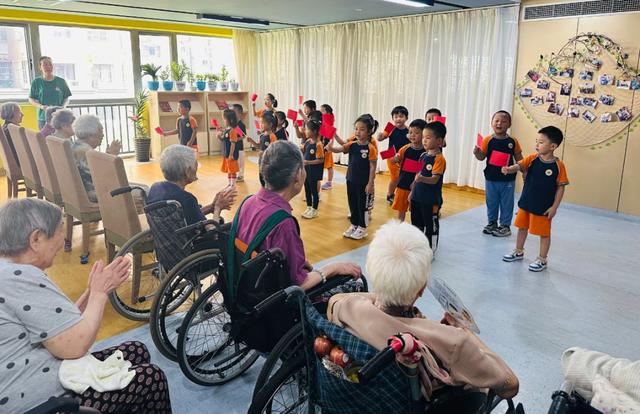 金苹果幼儿园的孩子们用清脆的歌谣与欢快的舞蹈,为长寿家园桃浦九村养老院的老人们带去了欢声笑语。