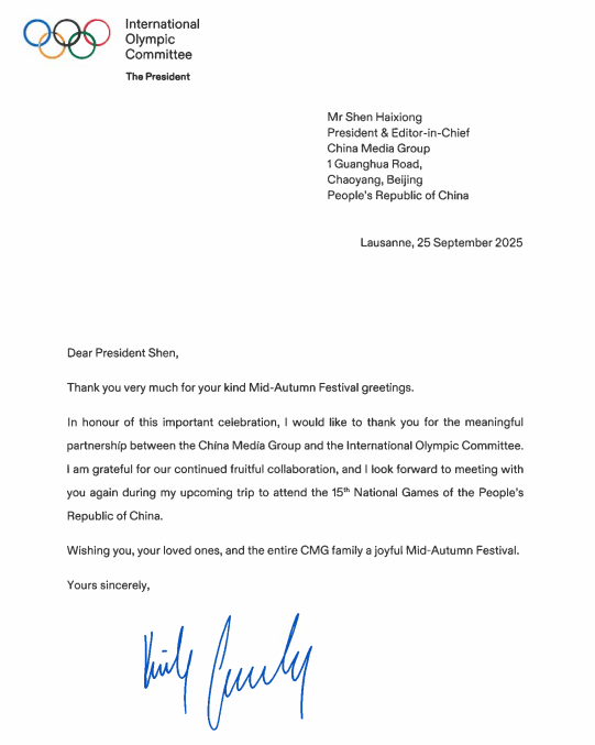 日前,国际奥委会主席考文垂给中央广播电视总台发来贺信,向总台全体员工致以中秋问候。