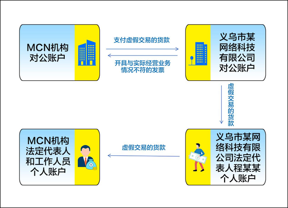 原来,该MCN机构法定代表人张旭阳和义乌市某网络科技有限公司法定代表人程某某早有勾结,而双方公司交易平台虚拟币的业务既有真实的,也有虚假的。真实业务是该MCN机构向义乌市某网络科技有限公司购买平台虚拟币,通过银行账户支付款项,义乌市某网络科技有限公司开具销售发票。在虚假交易中,该MCN机构要求对方为自己开具与实际经营业务情况不符的发票并支付货款。货款到达义乌市某网络科技有限公司对公账户后,程某某再转至自己个人账户,然后通过银行转账打到张旭阳和该MCN机构工作人员的个人账户中,最终形成了资金“回流”闭环。