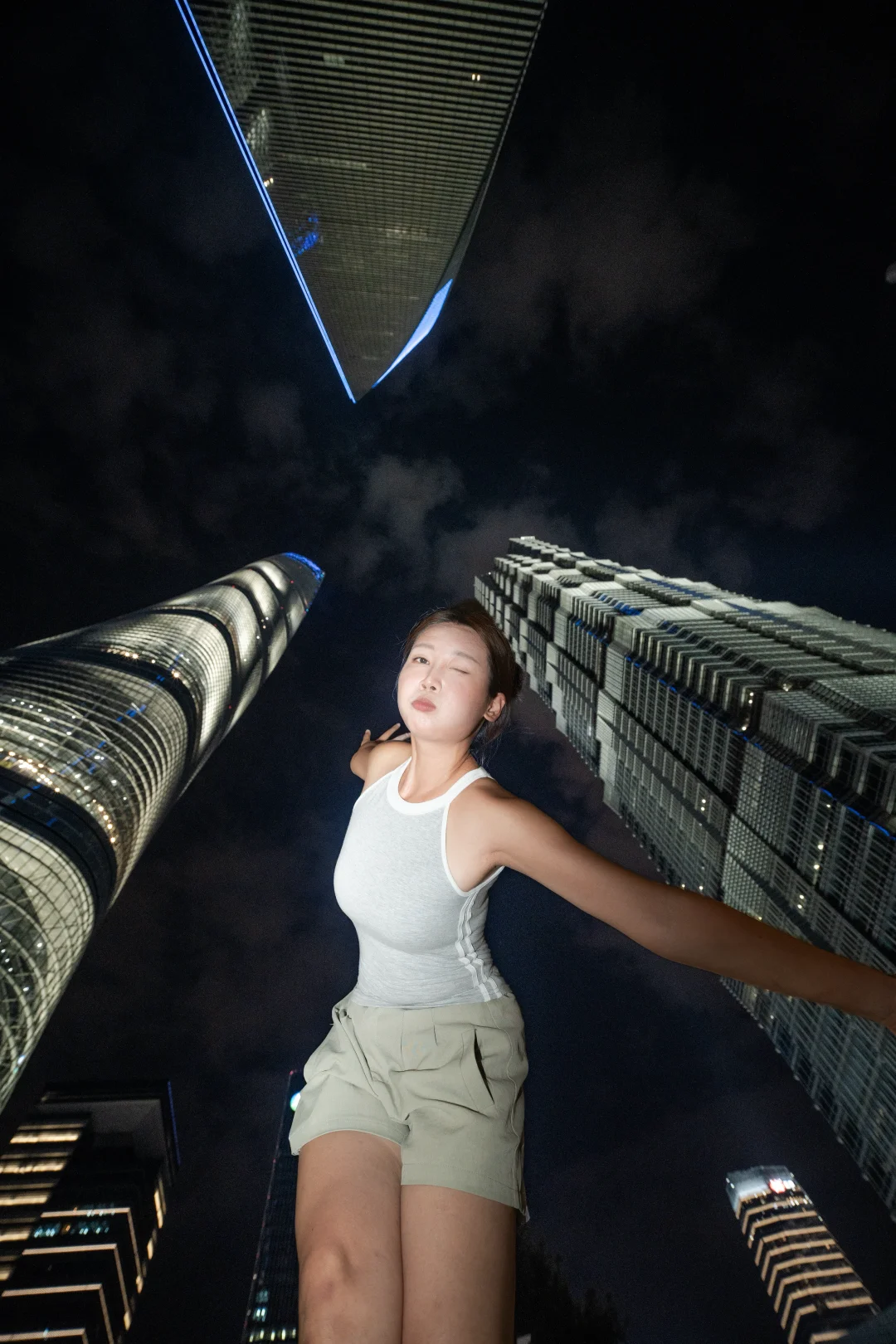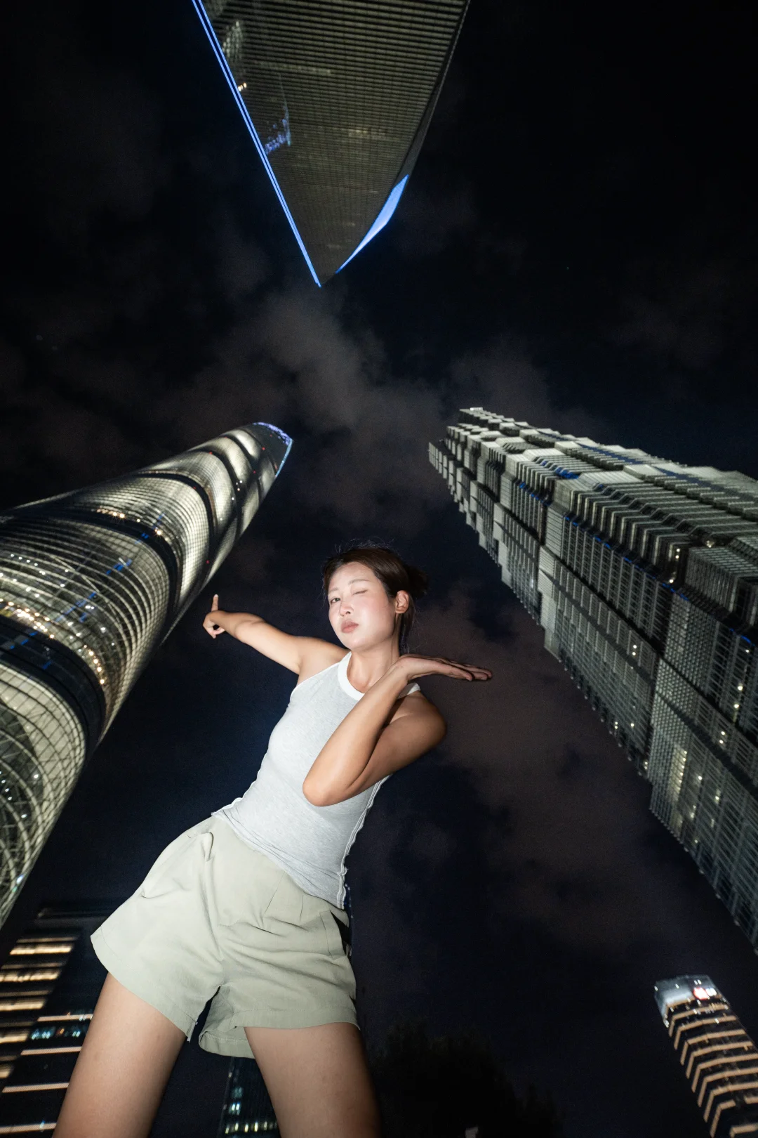 这是一个从地面往天空方向拍的超仰角,你一定要往镜头方向倒下去,你离镜头越近,你人的画面越大。超广角会让手的部份变得非常大。手的动作可以参考我图片。