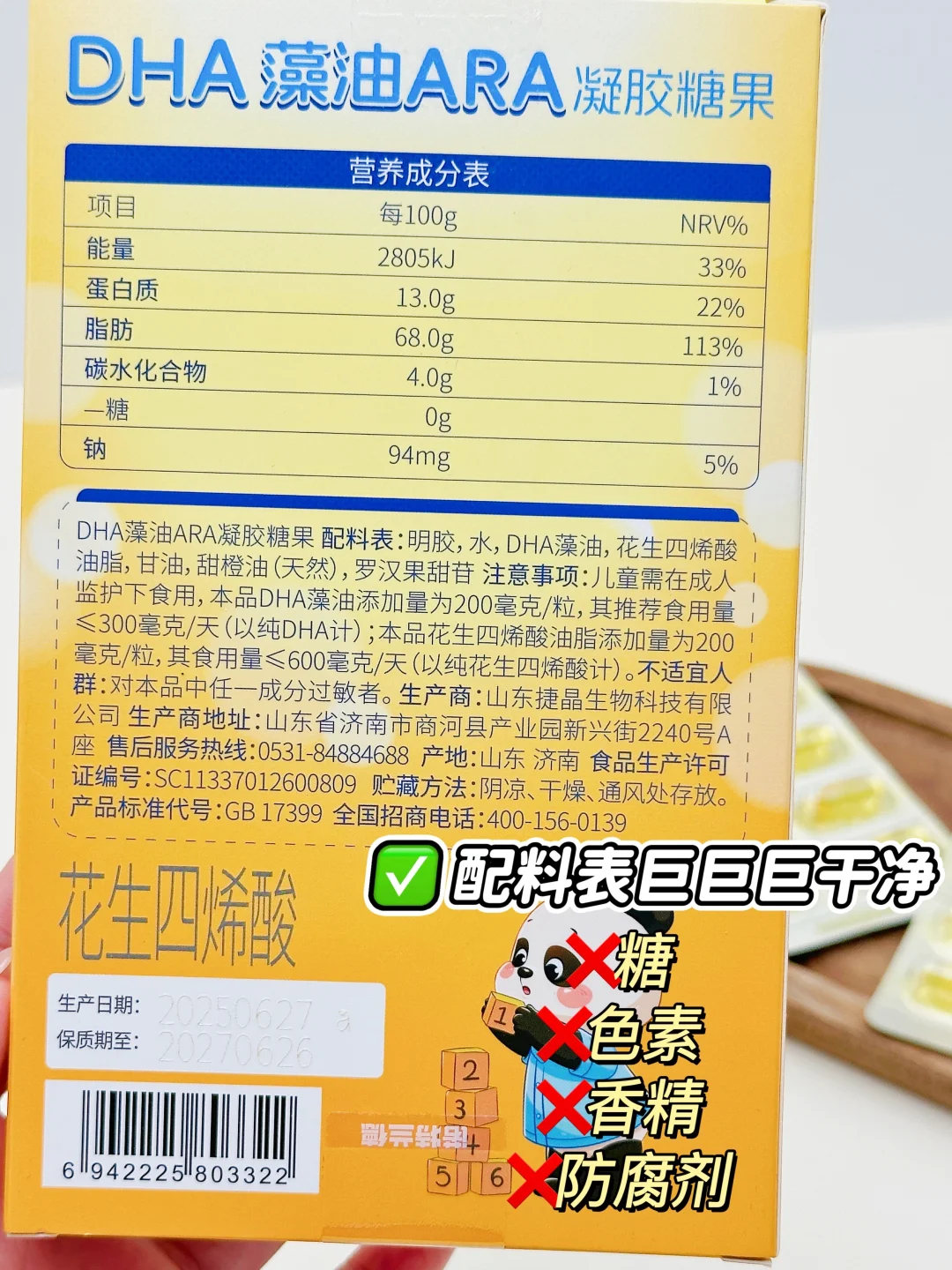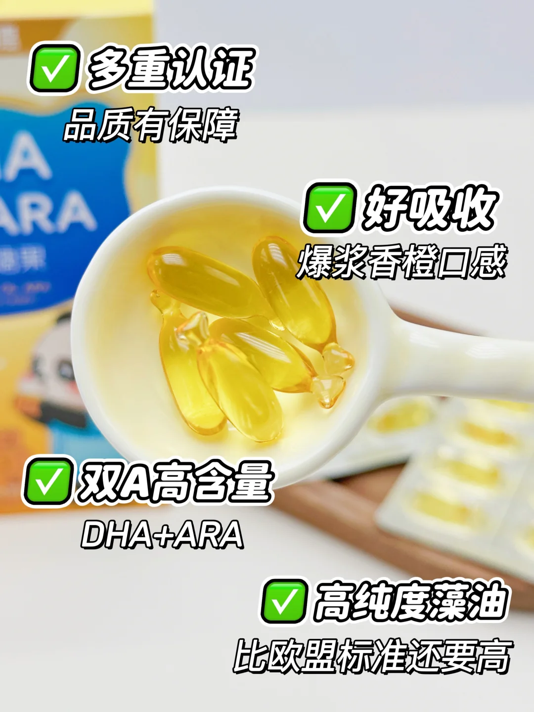 孩子特别喜欢这款,性价比也很高!像现在🍑有好价,还会更划算一些~它是双A配方,含有100mg DHA和100mg ARA,而且DHA纯度超50%,全程封闭发酵、无海洋污染风险,来源也有不少认证,吸收效果一级棒。最让孩子满意的是橙香爆浆的口感,完全没有腥味,接受度特别高~