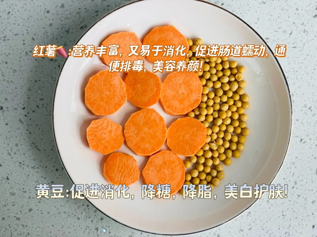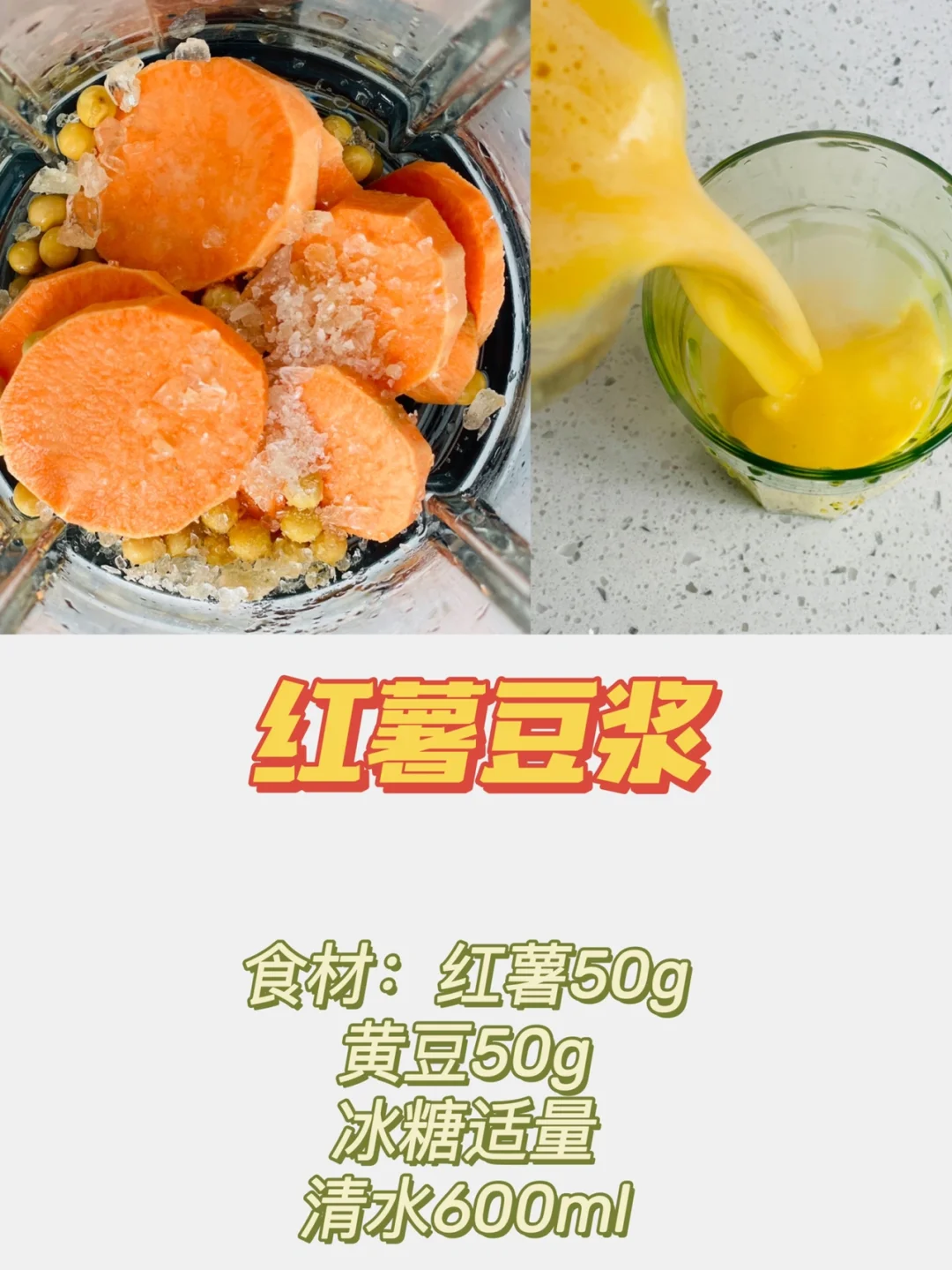 🔥红薯是种理想的减肥食品👍🏻 🔥黄豆促进消化,降糖降脂美白护肤👍🏻 🌿食材: 红薯50g 黄豆50g 冰糖适量 清水600ml 🌿做法: ①将所有食材放入破壁机中。 ②添加600ml清水。 ③豆浆模式。 🌈养生功效: 经常饮用红薯豆浆能让人在减肥的同时补充营养。尤其适合那些需要减肥的上班族引用,简单的食材快速方便,补脾益胃,润肠通便,美白养颜,提高免疫力[赞R][赞R][赞R]