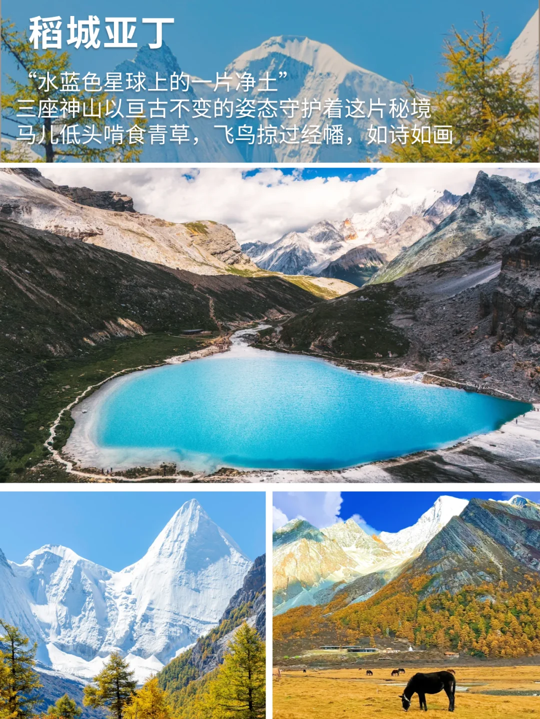 其中稻城亚丁的秋景尤为突出! 彩林 雪山 湛蓝海子 相拥呈现,每年只有极短的时间会同时出现~
