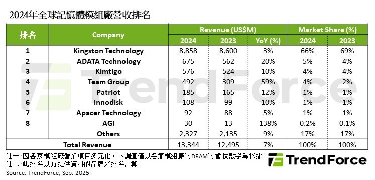 [集邦:金士顿以66%市占再度蝉联2024年全球第一大DRAM内存模组厂]由于下游消费市场去库存告一段落、上游产能被HBM和服务器DDR5占据,DRAM模组市场在2024年出现7%反弹,整体营收规模达133.44亿美元。