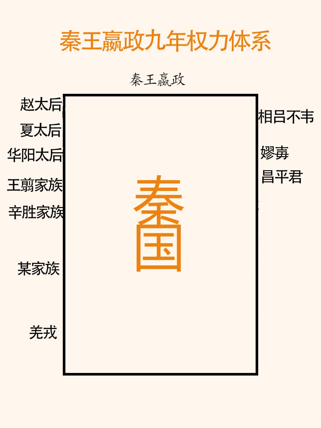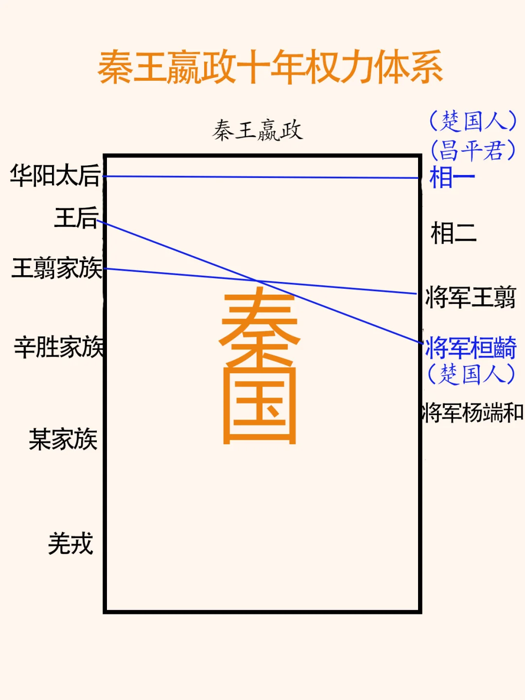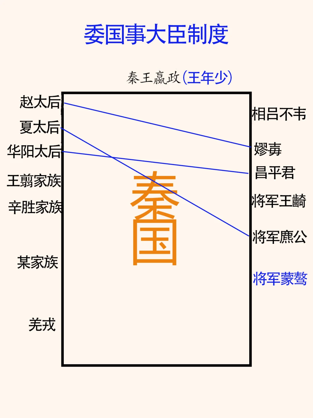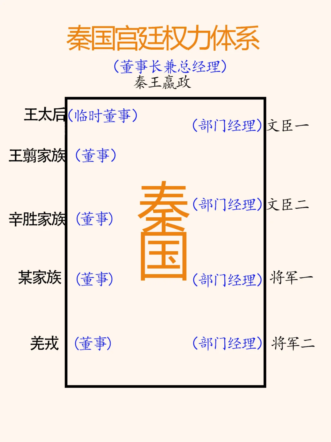 楚国人昌平君、昌文君为什么要帮助秦王嬴政平定“嫪毐之乱”? 要了解秦国宫廷权力体系。 图二、战国晚期秦国宫廷权力体系示意图。 为了更好的说明,假设秦国是个公司,来示意说明。 秦王嬴政(董事长兼总经理), 公司董事(宗室成员):王太后(临时董事)、王翦家族、辛胜家族、某家族既羌戎翟(少数民族)。 公司经理人:文臣一、文臣二、将军一、将军二。 权力大小说明: 1、董事长兼总经理,权力最大,秦王嬴政,有一票否决权。 2、临时董事,王太后(含王后),不能直接参政,需要找“代理人”,有任命一名大臣的权力,临时董事的时长由其子或秦王在位时间决定。 3、董事,文献记载为内史:王翦家族、辛胜家族、某家族(笔者未确定)、既羌戎翟(少数民族),不能直接参政,需要找“代理人”,有任命一名大臣的权力。 备注:大臣分为文臣和武臣,文臣最高为相邦、相,武臣为将军。大臣有直接管理权。 一、“嫪毐之乱”前秦国采用的是临时权力体系:委国事大臣,原因:王年少,初即位。图三。 《史记 秦始皇本纪》:年十三岁,庄襄王死,政代立为秦王。王年少,初即位,委国事大臣。 什么是“委国事大臣”制度,由于“王年少”,暂停秦王(董事长兼总经理)的权力,间接也暂停了董事(含临时董事)的权力。 这时秦国的权力“分布”,此时,大臣的权力是最大的,嫪毐是赵太后代理人,昌平君是华阳太后的代理人、将军王齮是王翦家族的代理人、将军麃公是夏太后的代理人,吕不韦应是先王庄襄王的人。 《史记 秦始皇本纪》:三年,王齮死。七年,将军骜死。八年,王弟长安君成蟜将军(麃公)击赵,反,死屯留。 二、秦王嬴政九年,嬴政登基掌权前的权力分布,图四。 临时“委国事大臣”制,三位将军已死,军队不能调用。只剩下文臣相邦吕不韦、嫪毐、大臣昌平君、昌文君等。 三、秦王嬴政十年,嬴政登基前的权力分布,图五。 平定“嫪毐之乱”后秦国宫廷权力分布: 1、董事长兼总经理,权力最大,秦王嬴政,有一票否决权。 2、临时董事,华阳太后,代理人秦相,昌平君。 3、临时董事,王后,代理人,将军桓齮(楚国人)。 4、董事,王翦家族,代理人,王翦将军。 5、董事、辛胜家族,代理人,辛胜将军。 结论:昌平君、昌文君帮助嬴政平定“嫪毐之乱”后,昌平君会代替吕不韦的位置。楚国人桓齮被封为将军,只有一个可能,桓齮是王后的代理人。 备注:了解这段历史的朋友会问:蒙骜和杨端和两位将军呢?下篇写。 嬴政历史秦国 秦始皇 吕不韦