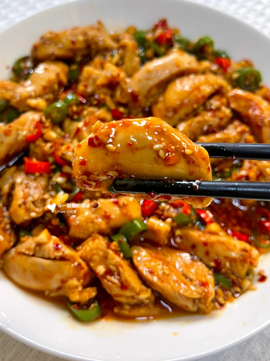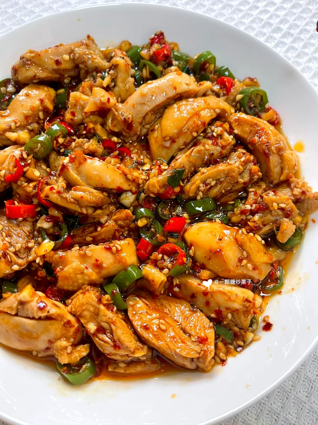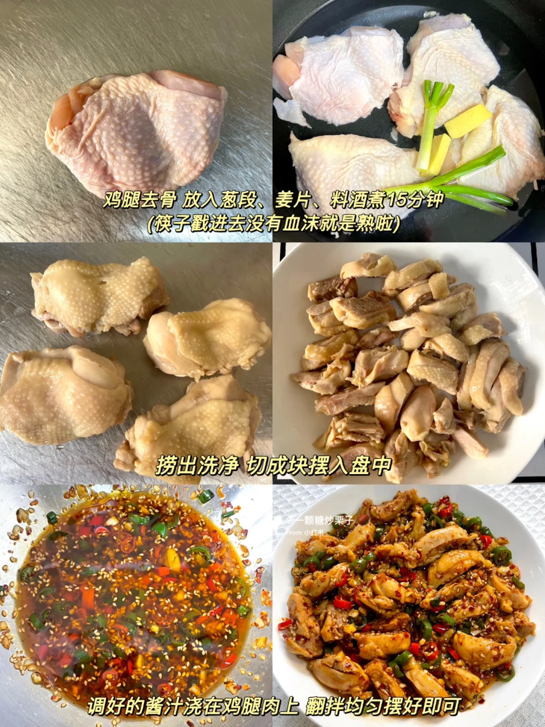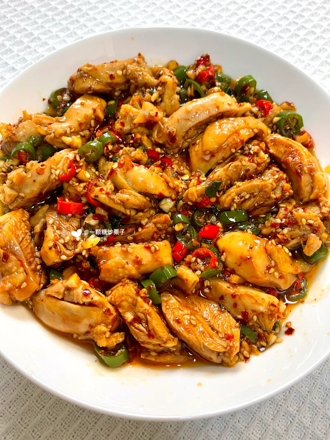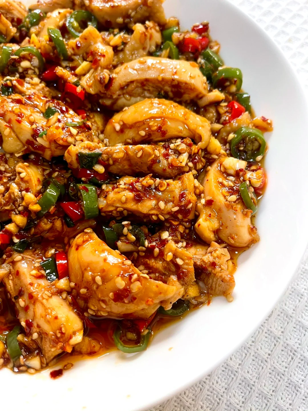 嫩滑多汁的鸡腿肉包裹着麻辣鲜香的酱汁