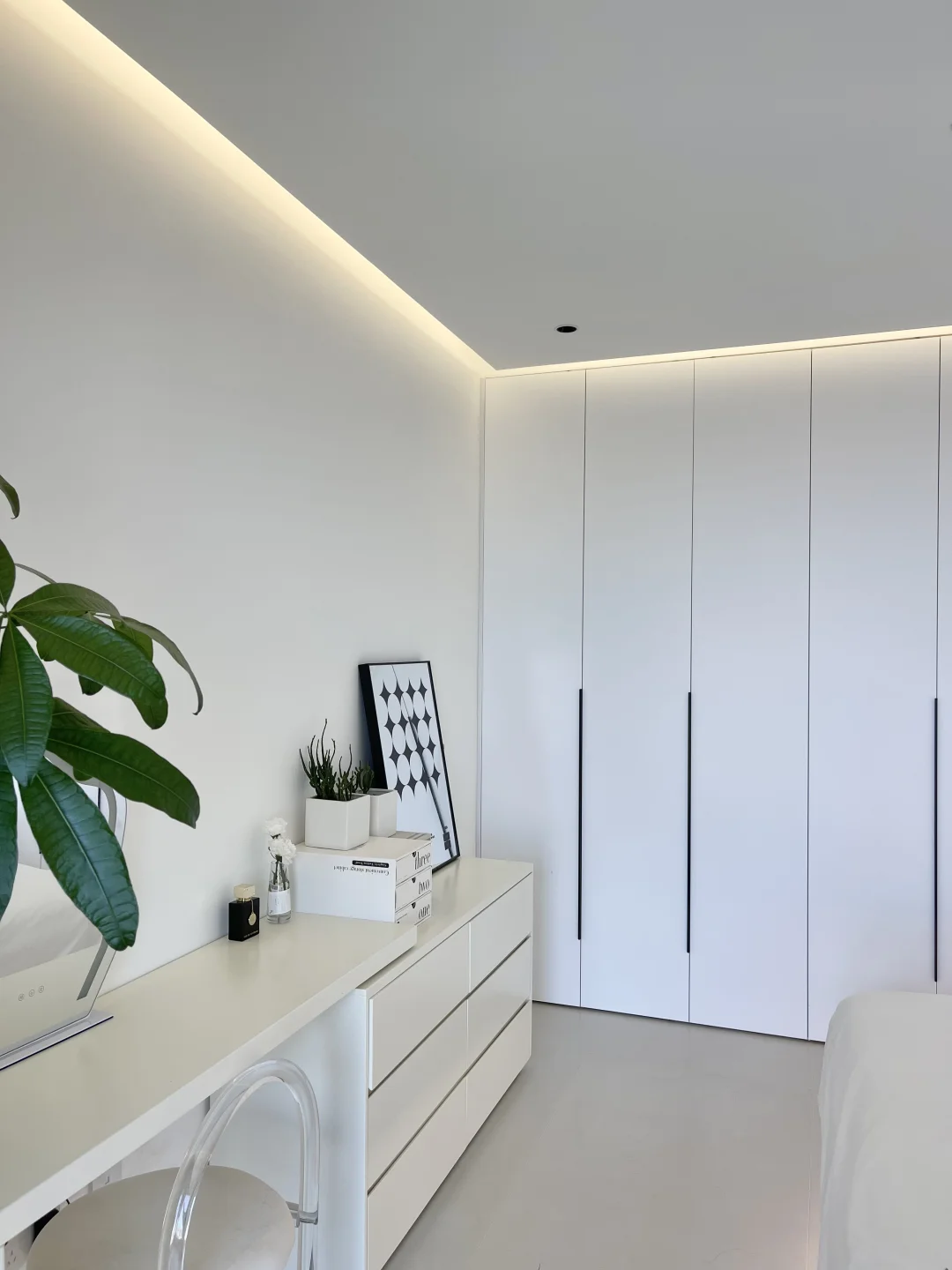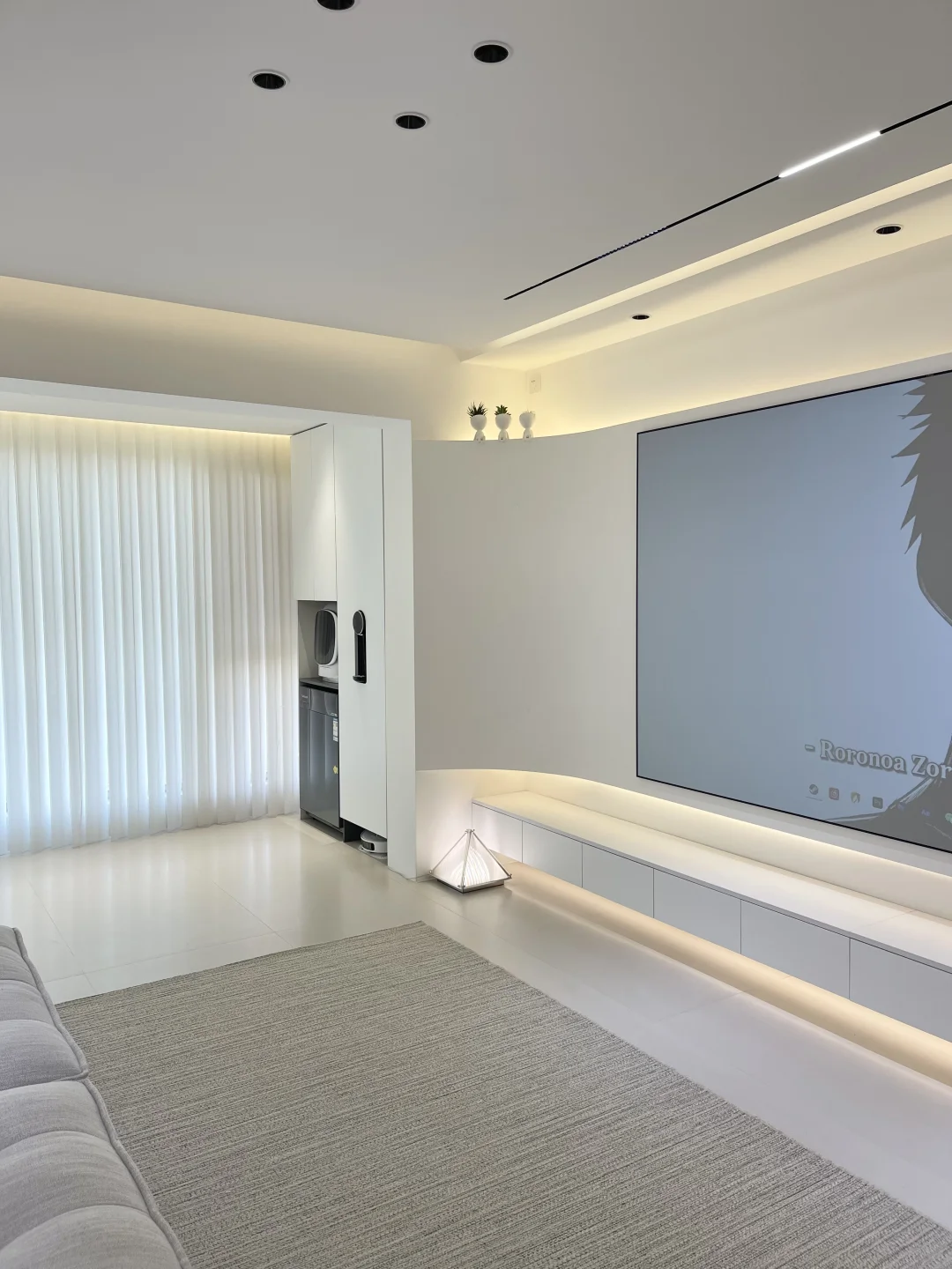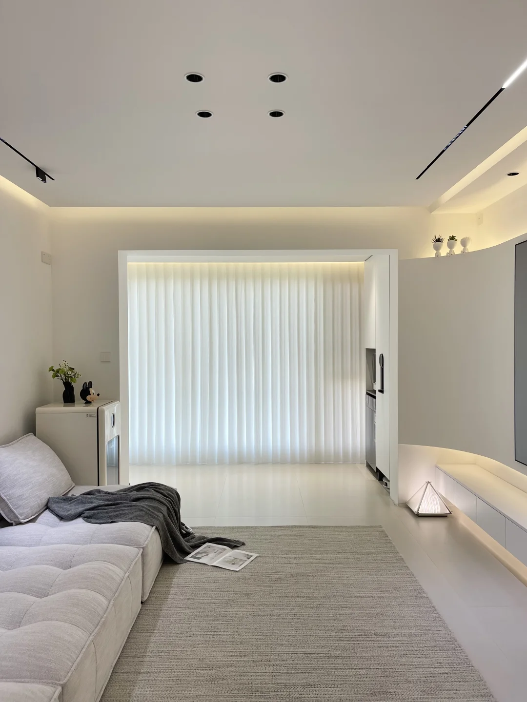 客厅是通铺柔光砖➕无主灯设计,🍏全屋纯白极简风,📺电视墙也是简单样式,1.3k就搞定了。