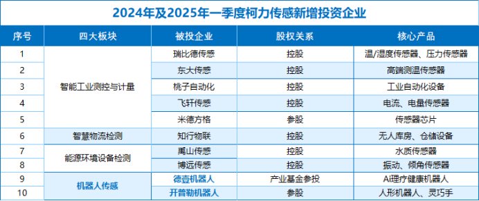 2024年完成"七控二投"9个项目,覆盖3D视觉、激光测距等20余种传感器。2025年投资开普勒人形机器人、他山科技等,实现从本体到底层传感器全覆盖。