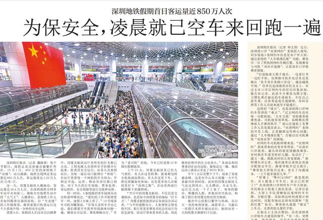 每个节假日,地铁总是这座城市最繁忙所在。10月1日,600公里的深圳地下“动脉”,动力满满,地铁全线网总客运量近850万人次,客运强度达1.39万人次/公里·日。