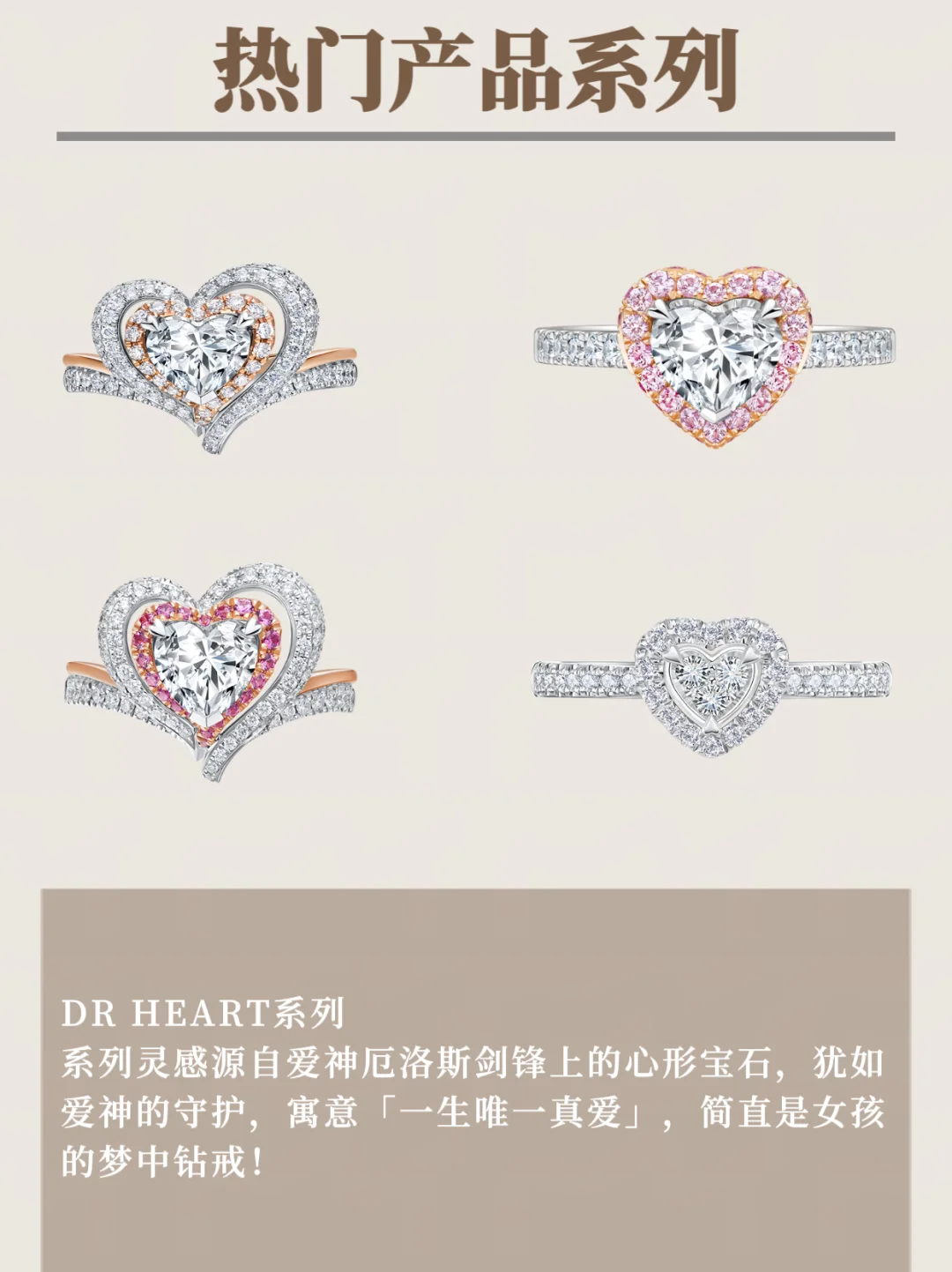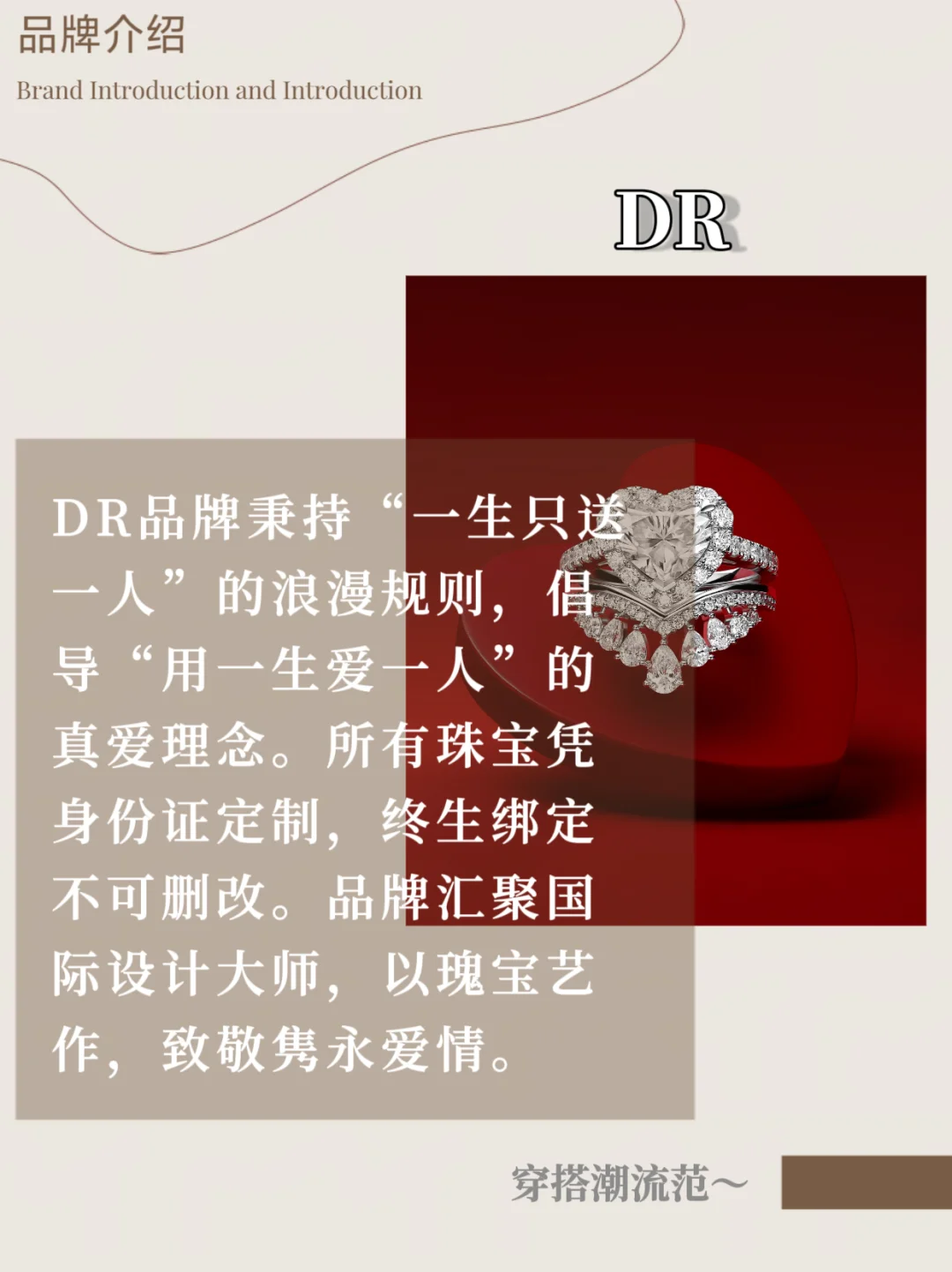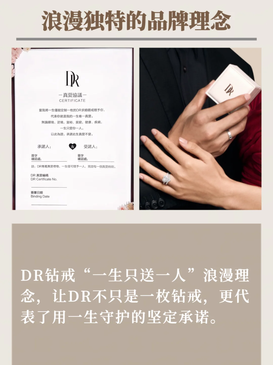 DR品牌秉持“一生只送一人”的浪漫规则,倡导“用一生爱一人”的真爱理念。所有珠宝凭身份证定制,终生绑定不可删改。品牌汇聚国际设计大师,以瑰宝艺作,致敬隽永爱情。