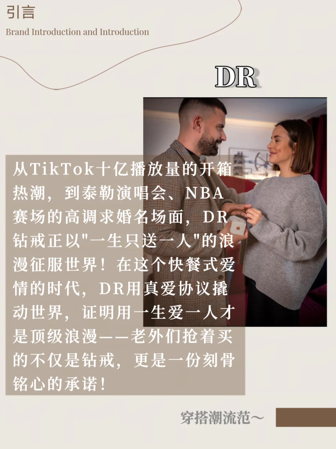 从TikTok十亿播放量的开箱热潮,到泰勒演唱会、NBA赛场的高调求婚名场面,DR钻戒正以"一生只送一人"的浪漫征服世界!在这个快餐式爱情的时代,DR用真爱协议撬动世界,证明用一生爱一人才是顶级浪漫——老外们抢着买的不仅是钻戒,更是一份刻骨铭心的承诺!