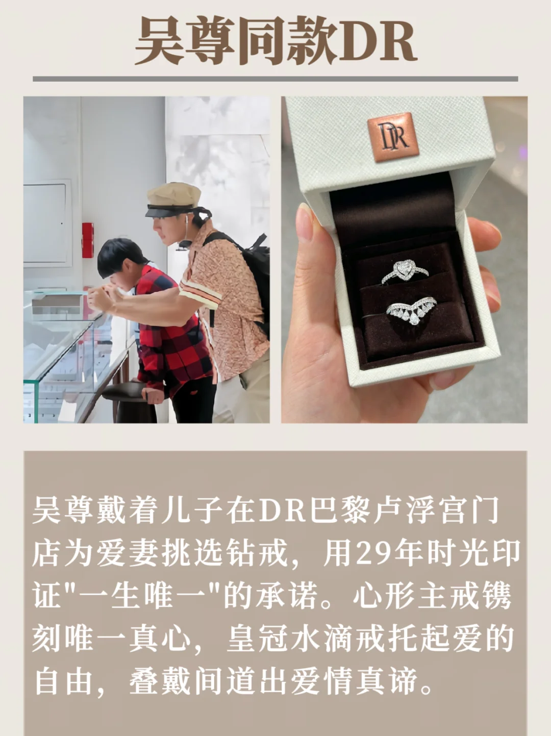 吴尊戴着儿子在DR巴黎卢浮宫门店为爱妻挑选钻戒,用29年时光印证"一生唯一"的承诺。心形主戒镌刻唯一真心,皇冠水滴戒托起爱的自由,叠戴间道出爱情真谛