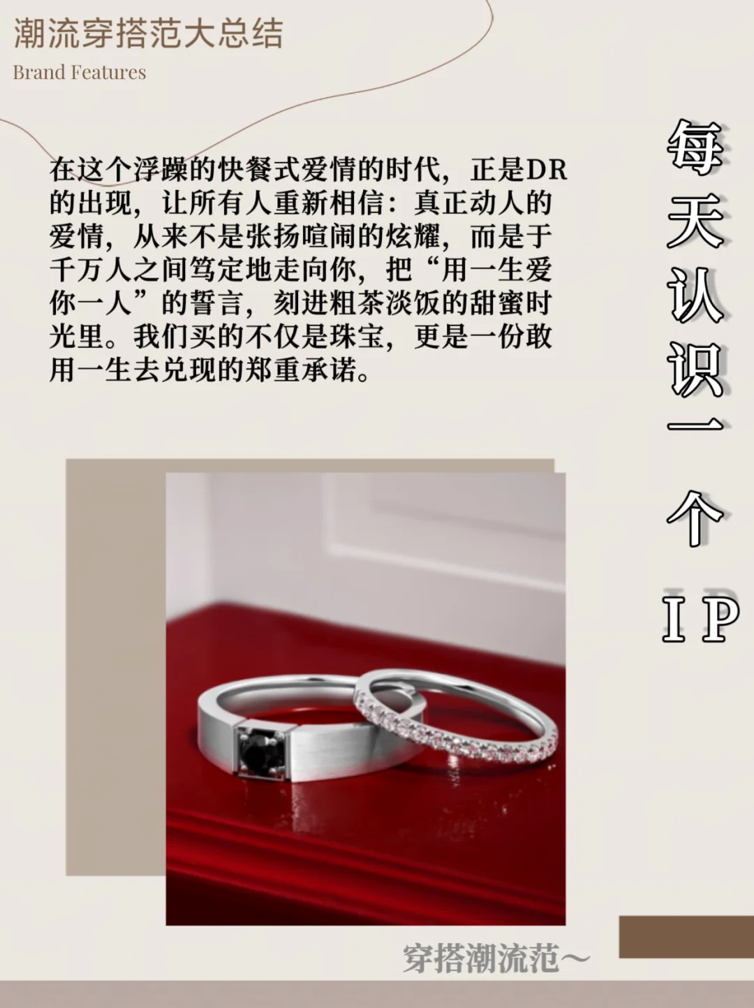 在这个浮躁的快餐式爱情的时代,正是DR的出现,让所有人重新相信:真正动人的爱情,从来不是张扬喧闹的炫耀,而是于千万人之间笃定地走向你,把“用一生爱你一人”的誓言,刻进粗茶淡饭的甜蜜时光里。我们买的不仅是珠宝,更是一份敢用一生去兑现的郑重承诺