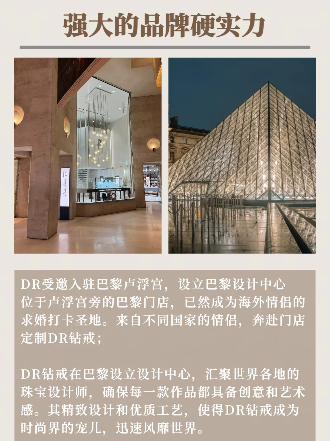 位于卢浮宫旁的巴黎门店,已然成为海外情侣的求婚打卡圣地。来自不同国家的情侣,奔赴门店定制DR钻戒;DR钻戒在巴黎设立设计中心,汇聚世界各地的珠宝设计师,确保每一款作品都具备创意和艺术感。其精致设计和优质工艺,使得DR钻戒成为时尚界的宠儿,迅速风靡世界。