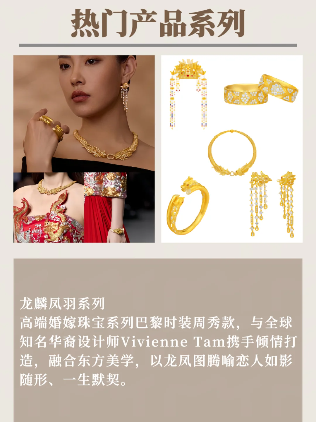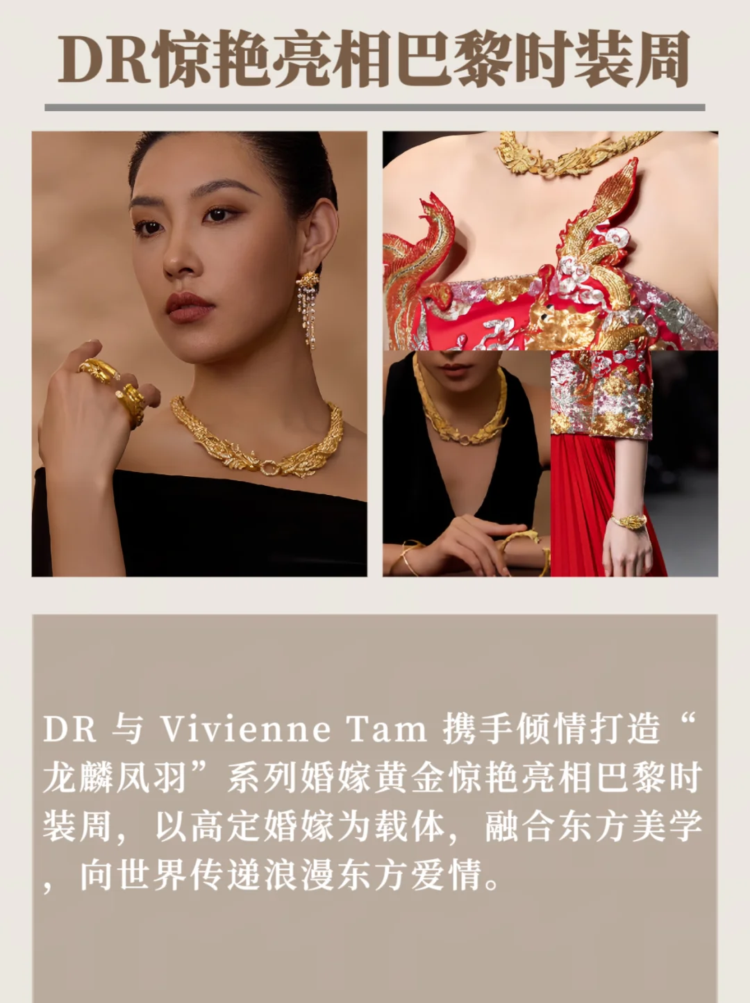 DR 与 Vivienne Tam 联手打造的“龙麟凤羽”系列婚嫁黄金惊艳亮相巴黎时装周,以高定婚嫁为载体,融合东方美学,向世界传递浪漫东方爱情。