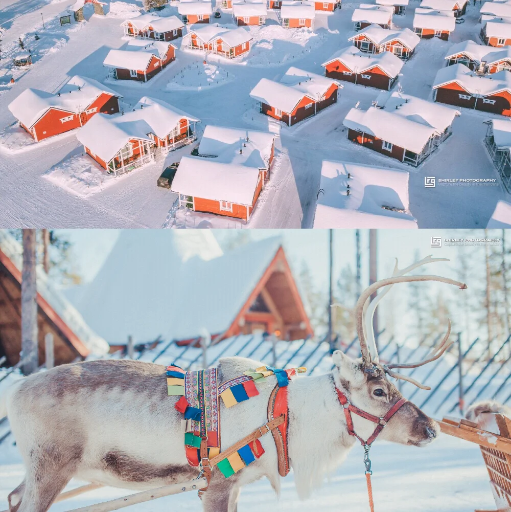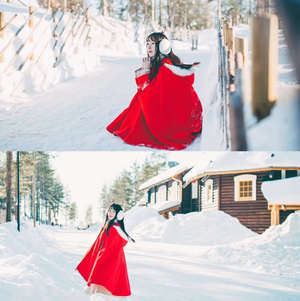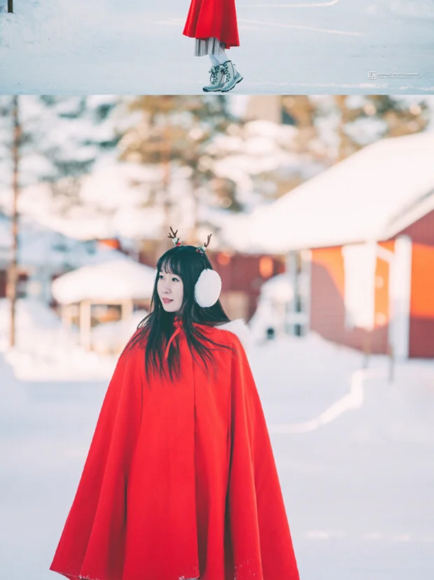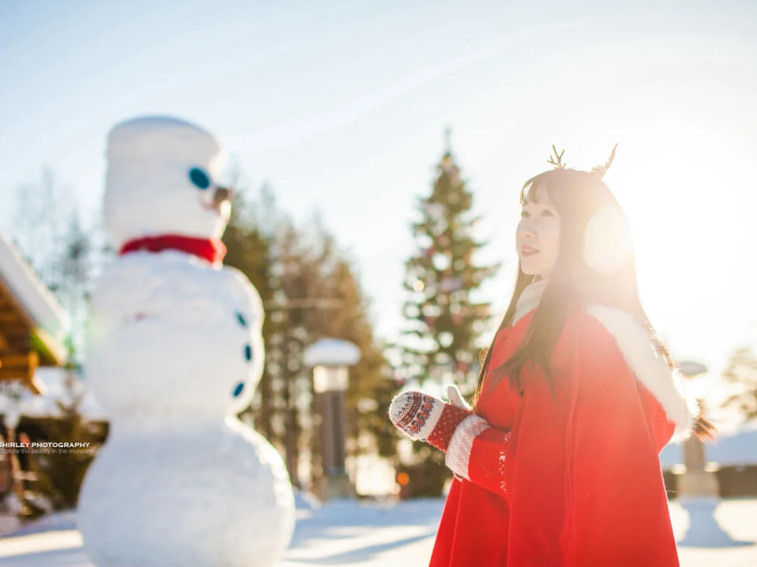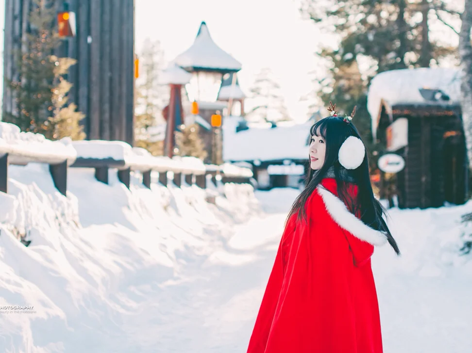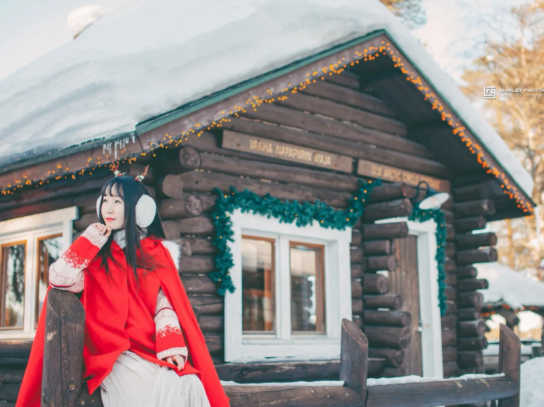 亲测雪地里怎么拍都美,因为地上的雪就像一块天然反光板,衬得肤色特别柔和。你只需要准备色彩鲜艳的衣服或者配饰就行。我准备了红色小斗篷和鹿角,本来想和驯鹿合影的,没想到圣诞老人村里的驯鹿被圈养了,而我参加的驯鹿雪橇活动又要穿活动公司的户外防寒服,心塞塞~😂不过罗瓦涅米的圣诞老人村里面也各种适合拍照取景,比如圣诞老人办公室门前那个大雪人那儿,还有大小不一错落有致的小木屋也都是天然写真背景。妹子们,带上你的摄影师,好好利用这片天然外景写真影棚吧!