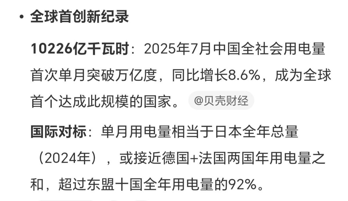 全社会用电量被称为经济运行的“晴雨表”。央视《焦点访谈》今晚播报:今年七月份,我国全社会用电量突破一万亿千瓦时,比日本去年全年总用电量9500亿千瓦时还多,也比德法两国去年全年加起来总用电量9400亿千瓦时还多!我国今年七月份的用电量比十年前2015年同期的用电量翻了一番,但今年各地并没有限电,用电量大幅增长却没有限电,背后是我国超强的发电能力和高速增长的储能装机。去年我国发电量超十万亿千瓦时,占全球1/3;截止今年上半年我国新型储能装机能力达到9500万千瓦,比五年前增长了30倍,居世界第一。