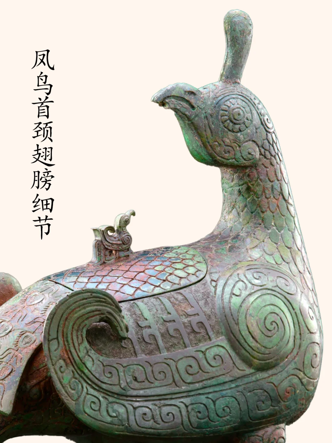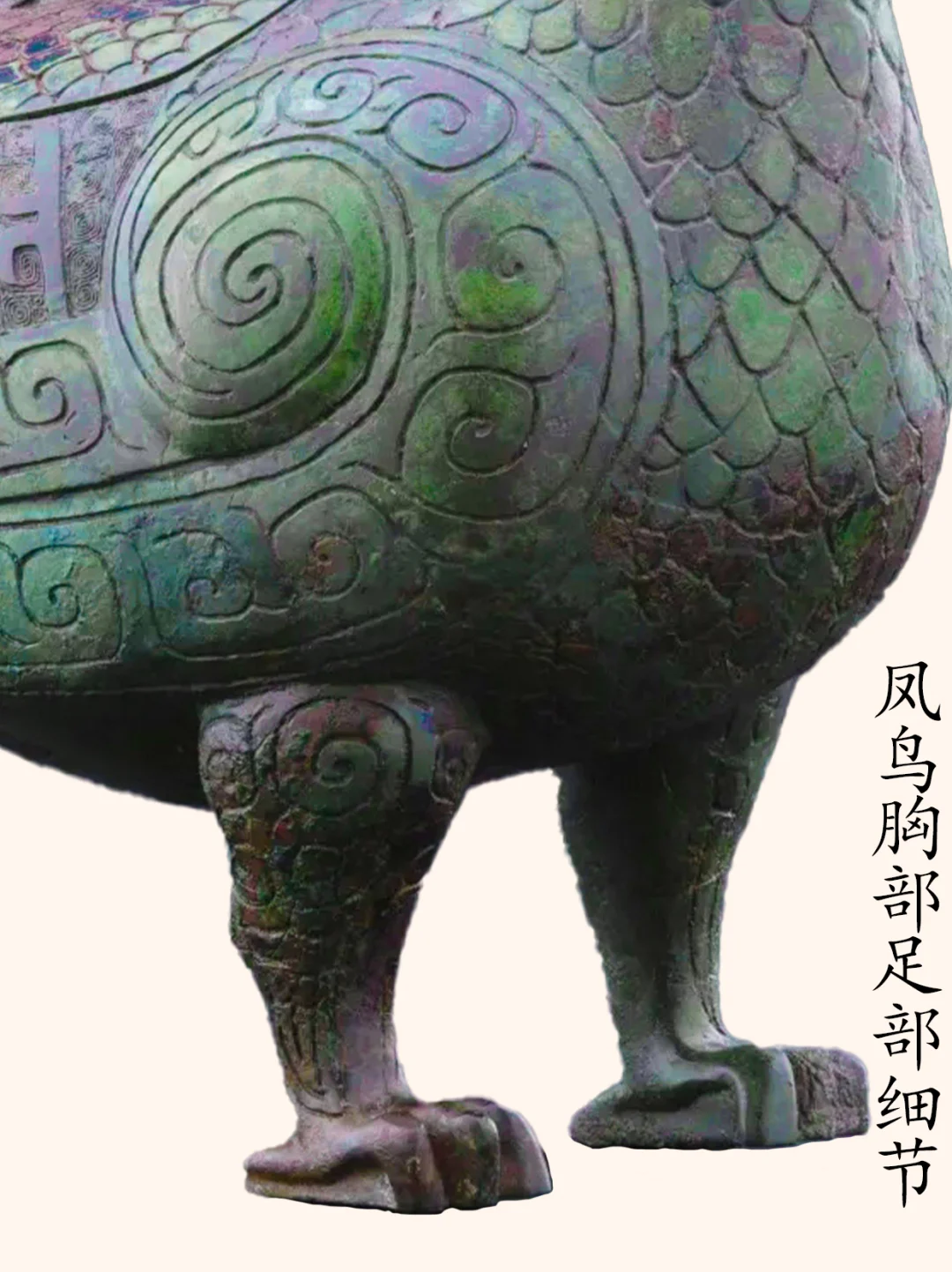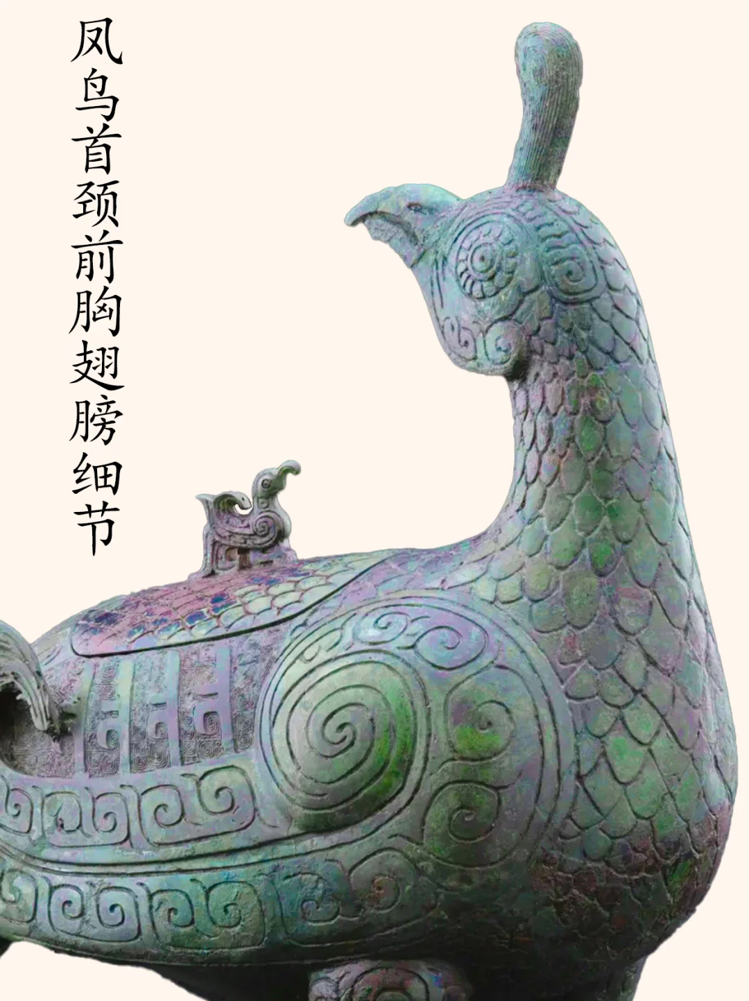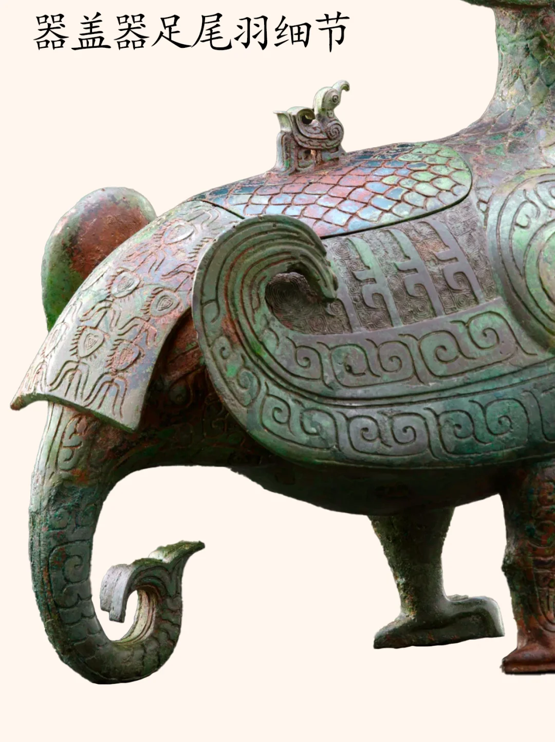 孔雀有三种,分别是绿孔雀、蓝孔雀和刚果孔雀,而我们平时在动物园见到的孔雀,基本上是蓝孔雀。 绿孔雀,一种身披金翠的珍稀鸟类,是我国唯一的本土原生孔雀。 历史上曾广泛分布于中原到华南的大片区域,但是目前仅分布于云南省中部、中南部和西部的部分区域,是目前最为珍稀濒危的野生动物物种之一,国家一级保护动物种群数量在550只到600只左右。 绿孔雀有着百鸟之王的称号,也是中国文化中吉祥之鸟凤凰的原型,绿孔雀更是“王中之王”。 今介绍山西博物院一件青铜器,是该院院徽、最高IP象征:晋侯凤鸟(绿孔雀)尊,博物馆展牌名称:晋侯鸟尊。 晋侯凤鸟(绿孔雀)尊的出土地——山西曲沃北赵村晋侯墓地第114号墓,早在1998年时就遭到了盗掘,2000年底抢救发掘时发现墓中大部分器物已被炸成了碎片,而这件鸟尊也成100多块残片。 2000年~2019年,山西博物院对晋侯鸟尊进行了三次修复,至此鸟尊已还原了最初形态。 器物名称:晋侯凤鸟(绿孔雀)尊,博物馆展牌名称:晋侯鸟尊。 时代:西周中期偏早(约公元前10世纪)。 收藏单位:山西博物院。 器物规格: 高39厘米,长30.5厘米,宽17.5厘米,2.5千克。 出土地点: 2000年底抢救性发掘山西曲沃北赵村晋侯墓地第114号墓出土 。 器物介绍: 外观 :这件文物的外形为立姿回首凤鸟形态,微微昂头,顶立高冠,双眼凝视。体态丰盈,翼尖上卷,鸟背设盖。盖钮设计成了小鸟形状。双腿坚实如柱,前爪尖而内勾。凤尾下设一象首,似象鼻内卷上扬,与两前支形成三点稳定支撑面。 纹饰:细节装饰,颈部、背部、腹部装饰有漂亮的羽片纹,双翅以雷纹打底,腿上饰以云纹,尾部为羽翎纹,器盖与翅膀之间也有雷纹,纹饰精美,庄重华丽。 器盖设计:凤鸟背上有盖,盖钮为一只站立的小鸟,正昂首仰望凤鸟,造型奇巧,栩栩如生。 器物铭文:盖内和腹底铸有相同的九字铭文 “晋侯作向太室宝尊彝”,表明了其身份是晋侯燮父祭祀祖先的专用酒器,“晋侯” 指制作鸟尊的燮父,“太室” 即太庙,“尊彝” 说明其为青铜盛酒器。 作者:九芒考古。 参考资料: 1、杜廼松:《中国古代青铜器小辞典》,文物出版社,1980年。 2、朱凤瀚:《古代中国青铜器》,南开大学出版社,1995年。 3、马承源:《中国青铜器》,上海古籍出版社,1988年。 青铜器 文物 文物之美 博物馆 考古 山西博物院 凤凰 凤凰原型 古文字