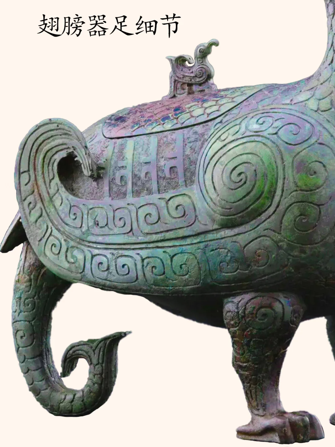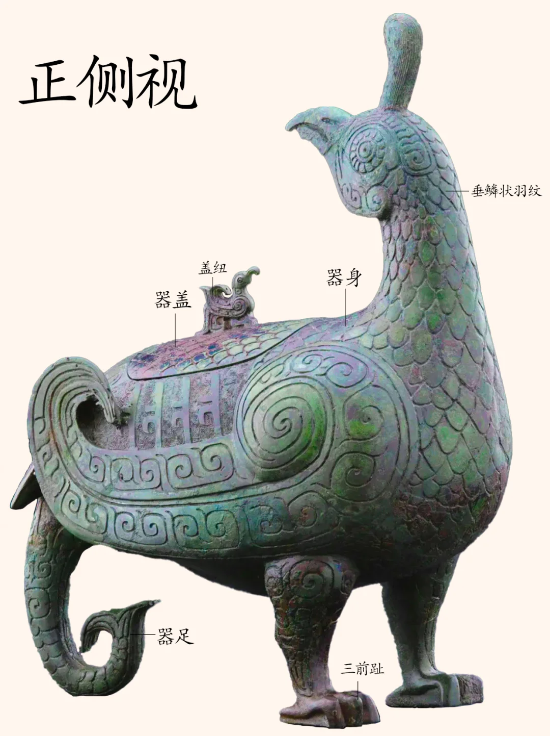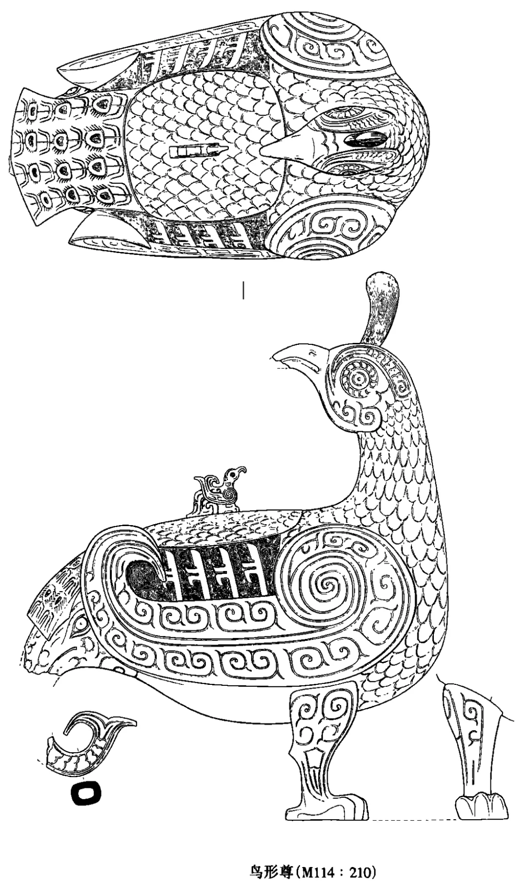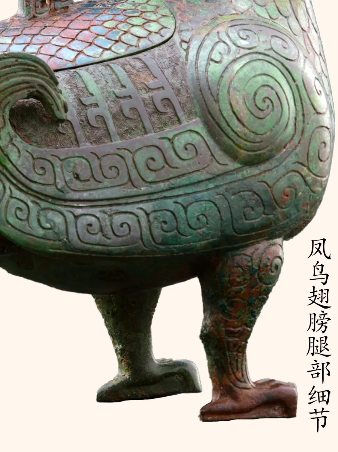 孔雀有三种,分别是绿孔雀、蓝孔雀和刚果孔雀,而我们平时在动物园见到的孔雀,基本上是蓝孔雀。 绿孔雀,一种身披金翠的珍稀鸟类,是我国唯一的本土原生孔雀。 历史上曾广泛分布于中原到华南的大片区域,但是目前仅分布于云南省中部、中南部和西部的部分区域,是目前最为珍稀濒危的野生动物物种之一,国家一级保护动物种群数量在550只到600只左右。 绿孔雀有着百鸟之王的称号,也是中国文化中吉祥之鸟凤凰的原型,绿孔雀更是“王中之王”。 今介绍山西博物院一件青铜器,是该院院徽、最高IP象征:晋侯凤鸟(绿孔雀)尊,博物馆展牌名称:晋侯鸟尊。 晋侯凤鸟(绿孔雀)尊的出土地——山西曲沃北赵村晋侯墓地第114号墓,早在1998年时就遭到了盗掘,2000年底抢救发掘时发现墓中大部分器物已被炸成了碎片,而这件鸟尊也成100多块残片。 2000年~2019年,山西博物院对晋侯鸟尊进行了三次修复,至此鸟尊已还原了最初形态。 器物名称:晋侯凤鸟(绿孔雀)尊,博物馆展牌名称:晋侯鸟尊。 时代:西周中期偏早(约公元前10世纪)。 收藏单位:山西博物院。 器物规格: 高39厘米,长30.5厘米,宽17.5厘米,2.5千克。 出土地点: 2000年底抢救性发掘山西曲沃北赵村晋侯墓地第114号墓出土 。 器物介绍: 外观 :这件文物的外形为立姿回首凤鸟形态,微微昂头,顶立高冠,双眼凝视。体态丰盈,翼尖上卷,鸟背设盖。盖钮设计成了小鸟形状。双腿坚实如柱,前爪尖而内勾。凤尾下设一象首,似象鼻内卷上扬,与两前支形成三点稳定支撑面。 纹饰:细节装饰,颈部、背部、腹部装饰有漂亮的羽片纹,双翅以雷纹打底,腿上饰以云纹,尾部为羽翎纹,器盖与翅膀之间也有雷纹,纹饰精美,庄重华丽。 器盖设计:凤鸟背上有盖,盖钮为一只站立的小鸟,正昂首仰望凤鸟,造型奇巧,栩栩如生。 器物铭文:盖内和腹底铸有相同的九字铭文 “晋侯作向太室宝尊彝”,表明了其身份是晋侯燮父祭祀祖先的专用酒器,“晋侯” 指制作鸟尊的燮父,“太室” 即太庙,“尊彝” 说明其为青铜盛酒器。 作者:九芒考古。 参考资料: 1、杜廼松:《中国古代青铜器小辞典》,文物出版社,1980年。 2、朱凤瀚:《古代中国青铜器》,南开大学出版社,1995年。 3、马承源:《中国青铜器》,上海古籍出版社,1988年。 青铜器 文物 文物之美 博物馆 考古 山西博物院 凤凰 凤凰原型 古文字