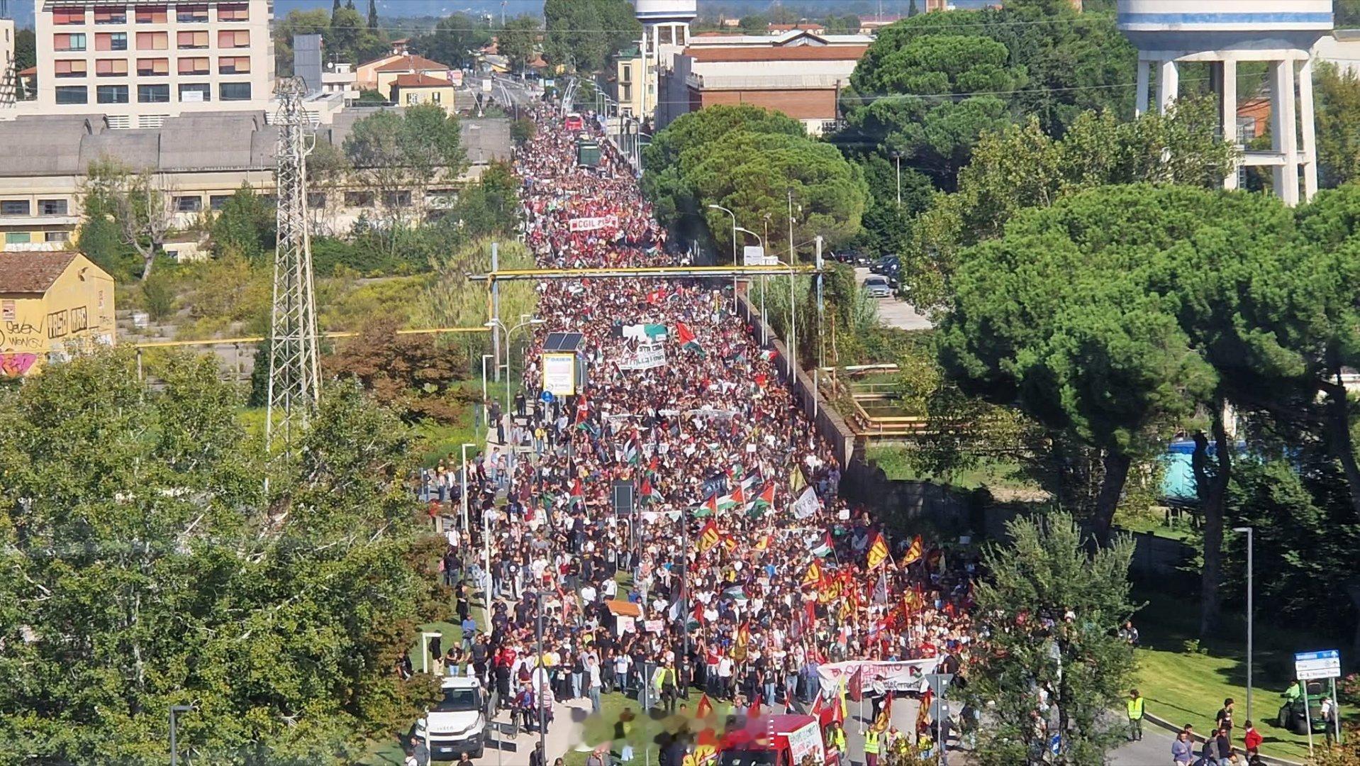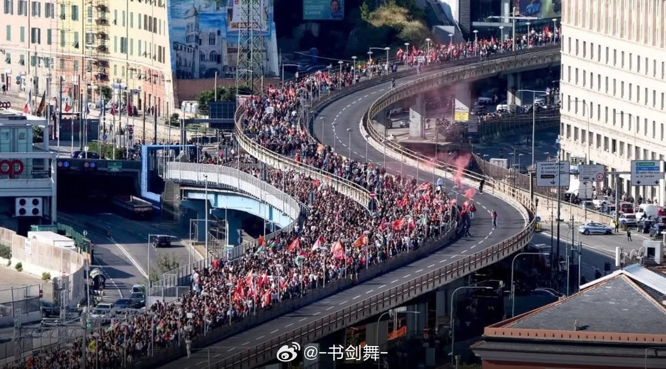 这是数十个城市连续第三天举行抗议活动,数以万计的民众走上街头,反对对巴勒斯坦人民的种族灭绝行径,也抗议意大利政府的共谋行为。