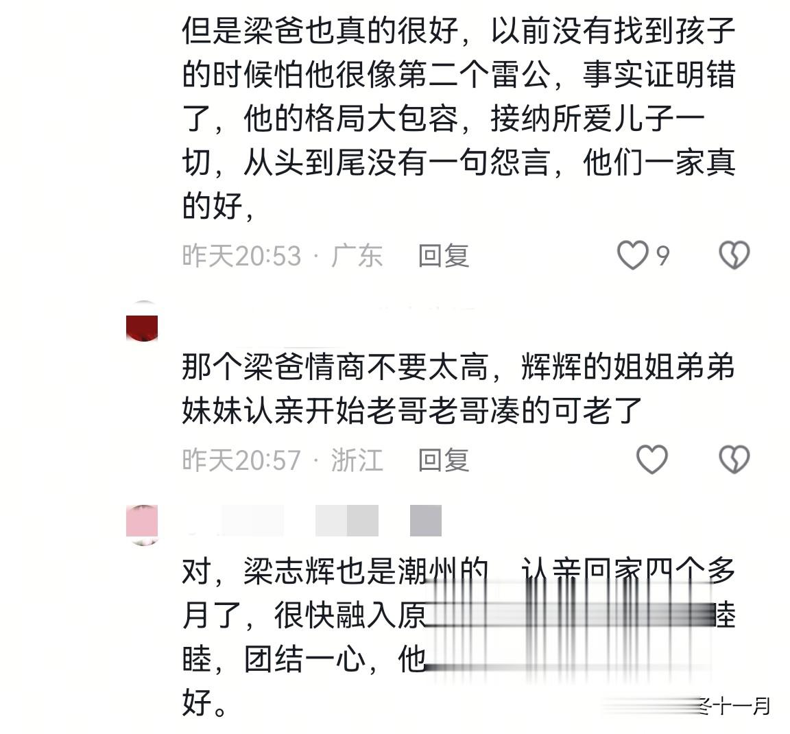 也有网友提到了梁志辉一家人,夸赞梁爸梁妈家事关系处理的好。