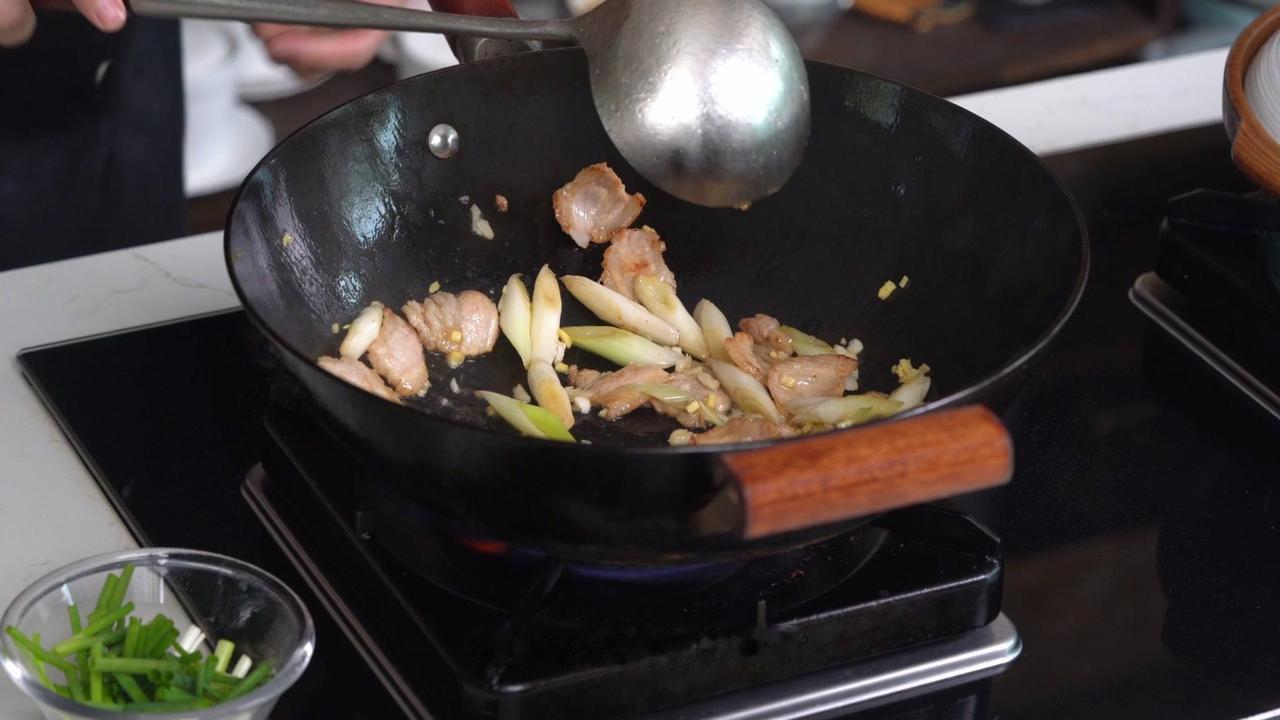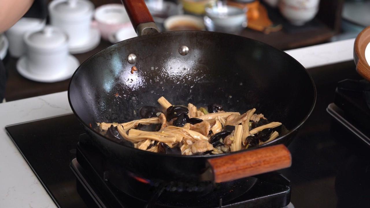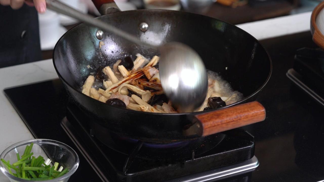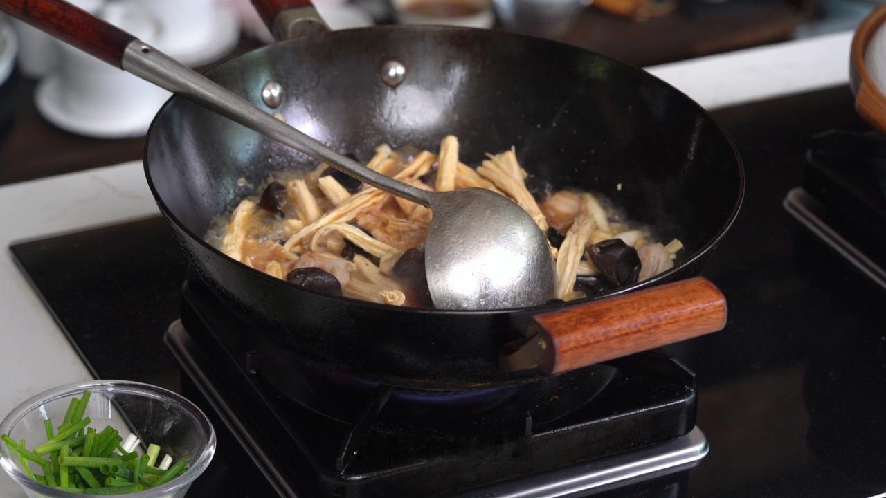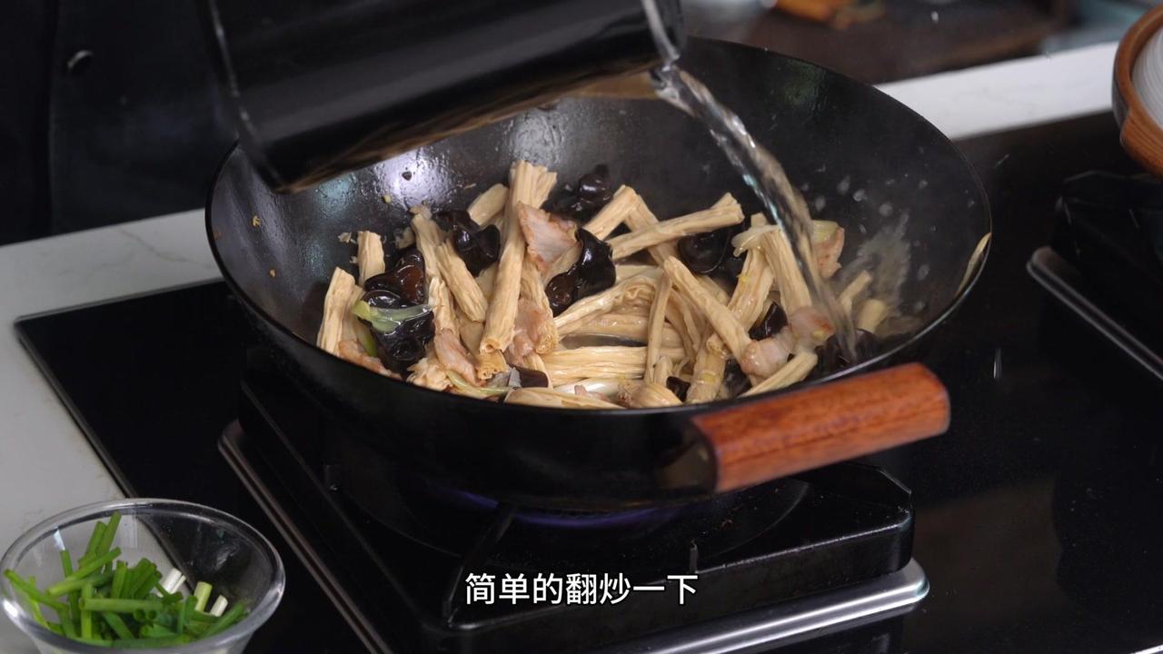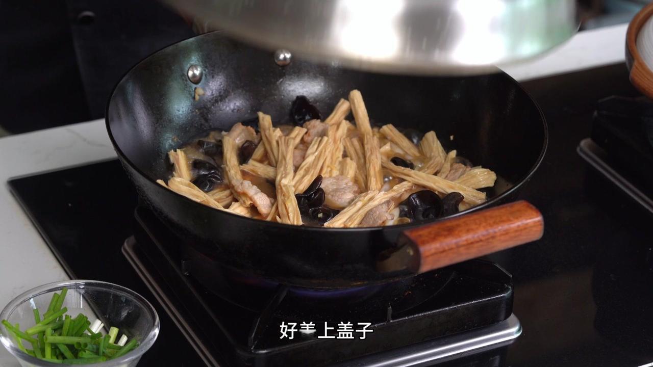 葱烧腐竹,比肉还香!🍗没有猪油的话,五花肉煸香也很绝,煸出油脂后香味更浓~ 1️⃣处理食材:切好的五花肉冷水下锅焯水,捞出用温水泡软腐竹,木耳提前泡发,大葱切段,姜蒜切末备用~ 2️⃣炒制调味:油热后下五花肉,煸出油脂后沿锅边淋花雕酒去腥,再下葱段炒香,加入姜蒜末爆香,放入腐竹和木耳简单翻炒~ 3️⃣炖煮收汁:加温热水没过食材,放生抽、蚝油、白胡椒粉、盐、白糖调味,盖上锅盖中火煮5分钟,最后勾薄芡,撒葱段出锅,汤汁拌米饭绝了~