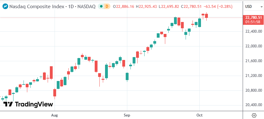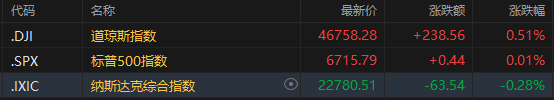 截至收盘,道琼斯指数涨0.51%,报46758.28点;标普500指数涨0.01%,报6715.79点,双双刷新了前一天录得的收盘纪录;纳斯达克综合指数跌0.28%,报22780.51点。