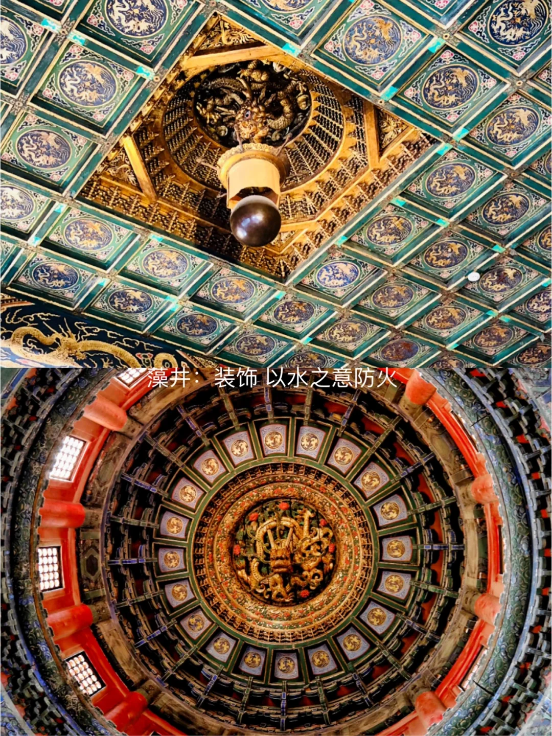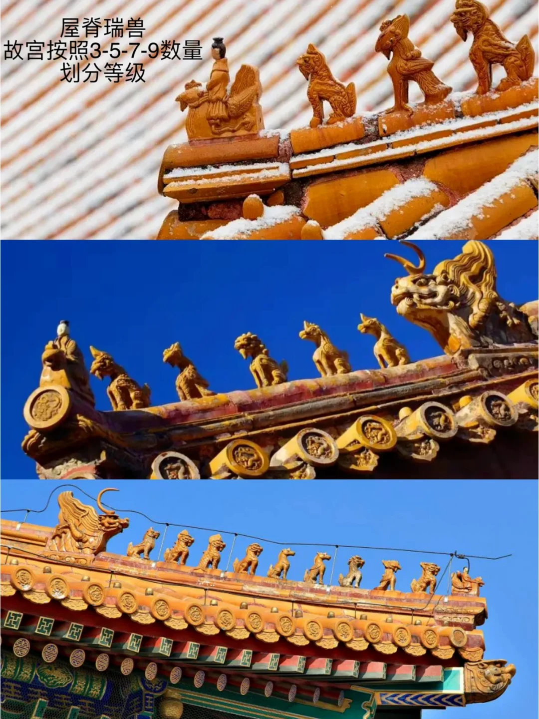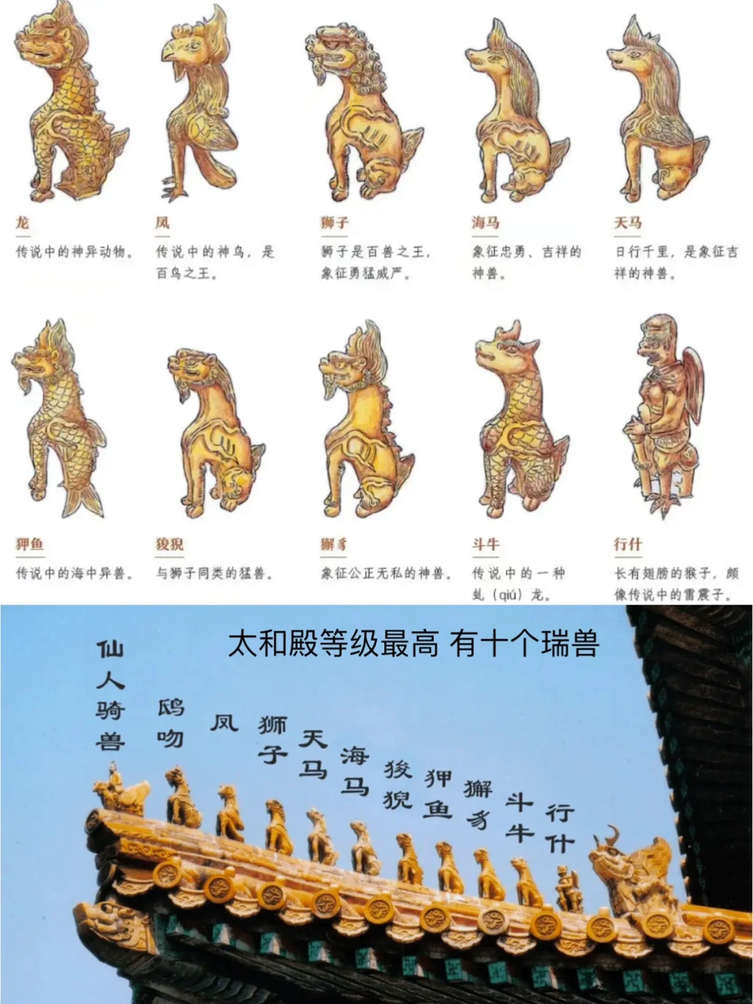 在中国古建筑艺术中,屋顶的形制大有讲究。 先说屋檐层数,两层比一层等级高,叫重檐。再说样式,最厉害的是庑殿式,四面都是斜坡。 故宫太和殿便是重檐庑殿顶,等级至高,皇帝登基、大婚、朝贺,都在那儿举行。 歇山式等级次之,但很有特点,侧面看像屋脊劈了个小叉,正面看又像绅士的礼帽。 太和门屋顶是典型的重檐歇山式,明代皇帝在此上朝。 故宫角楼屋顶则为两个歇山式十字相交,是故宫最复杂的建筑。 民居屋顶大多为悬山式和硬山式,悬山式屋檐伸出,硬山式屋檐和墙相连。 在园林建筑中,屋顶的正脊被弧形取代,以映衬自然野趣,这叫卷棚式屋顶,在颐和园里就能看到。 再说下攒尖式屋顶,顾名思义它有个尖儿,所以多见于亭阁。 不过,在故宫,供皇帝上朝前修整的中和殿和皇后接受朝贺的交泰殿,也是这种形制。 瓦是屋顶的重要材料,黄色为尊,用于故宫和孔庙;绿色次之,用于王府和寺院;蓝色类天,用于天坛;黑色属水,寓意克火,用于藏书阁或小官、富贵之家,而未上任何釉色的,则为民居所用。 瓦可分为筒瓦和板瓦,筒瓦大于或等于半圆,为屋顶凸处,末端连着瓦当;板瓦小于半圆,为屋顶凹处,末端连着滴水。这样凹凸结合,像小波浪一般的铺陈方式,也被称为仰合瓦。 在古建筑屋顶正脊两端,都会有装饰,汉朝时为翘起的形状;南北朝时为鸱尾;唐朝时叫鸱吻,是龙的儿子,能兴雨防火,民居不能用龙,则用鳌鱼代替。 垂脊上也有走兽,最开头的是骑凤仙人,相传为齐闵王,在溃兵之际遇凤凰拯救,所以有逢凶化吉的含义。之后的脊兽数目以3/5/7/9递增,出现在故宫由低到高的等级建筑上。 太和殿是唯一拥有10个脊兽的宫殿,地位最高。它们分别为龙、凤、狮子,日行千里的天马、象征忠勇的海马、保平安的狻猊、能兴雨的押鱼、辨忠奸的獬豸、防水患的斗牛以及太和殿独有、形同雷震子的行十。 除了庑殿式,其余屋顶都只有两面斜坡,因此侧面会有人字形木板维护,叫做博风板,它的中间有悬鱼衔接、两边有惹草装饰,均代表着以水灭火的寓意。 博风板下空出的三角区,名为山花,明代以前是空出来的,后来被封住,并有雕刻装饰,极为精美。 走进宫殿内,便能看见天花板,中央凹进去的是藻井,以莲、藻等水生物装饰,突出龙雕,将水的寓意发挥到最大,用以防火。
