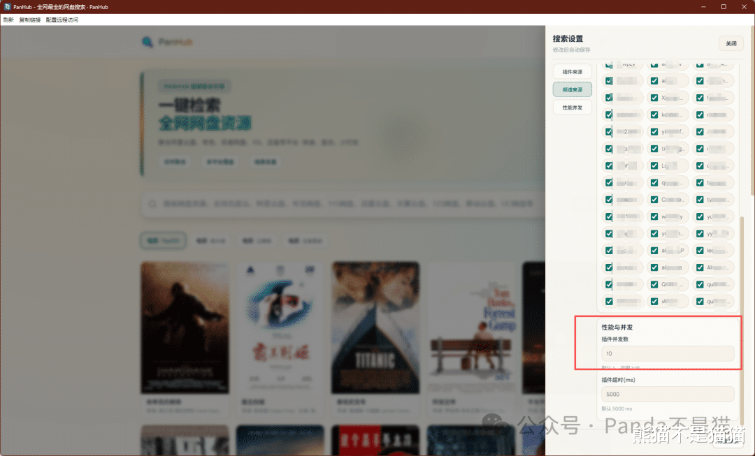 右上角的设置图标能看到对应的插件源以及频道源,源内置就有,信息都来自于网络,其中大部分都是可用的。同时可以设置并发搜索数量,如果NAS性能不错,可以设置高一些。