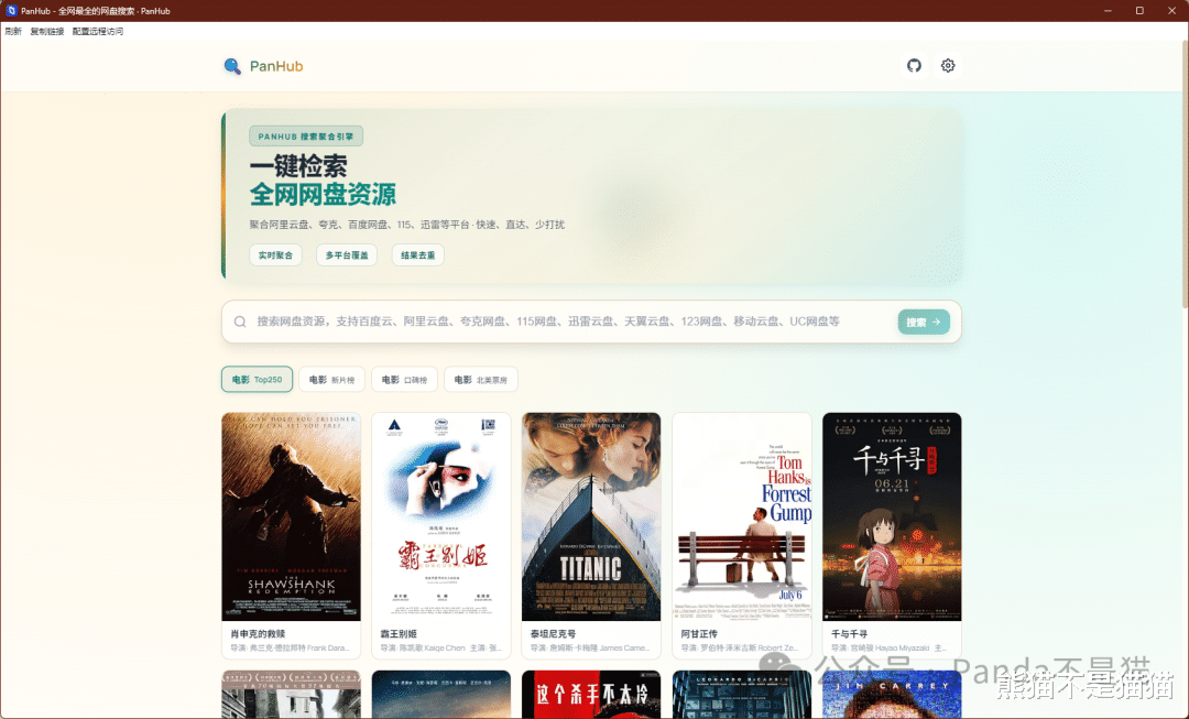 项目目前在GitHub开源,搜索PanHub就能找到。整个项目的界面设计非常简洁,除了搜索框,下方就是电影Top150、新片榜、口碑榜以及票房榜。