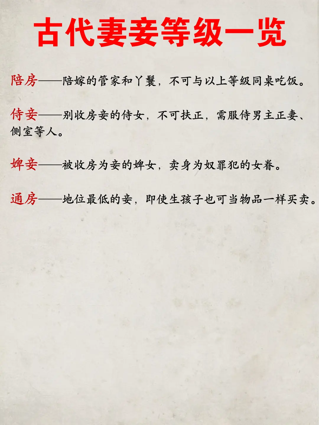 古代妻妾等级一览! 👉妻妾制度于古代社会而言,是一种屡见不鲜的社会现...