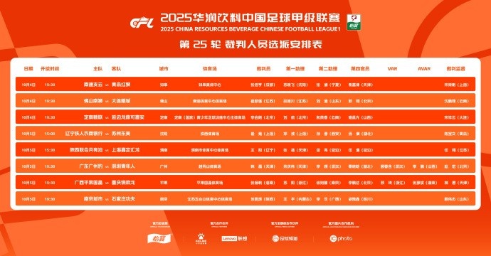 中甲第25轮具体裁判安排如下(详情如图):