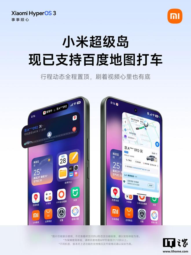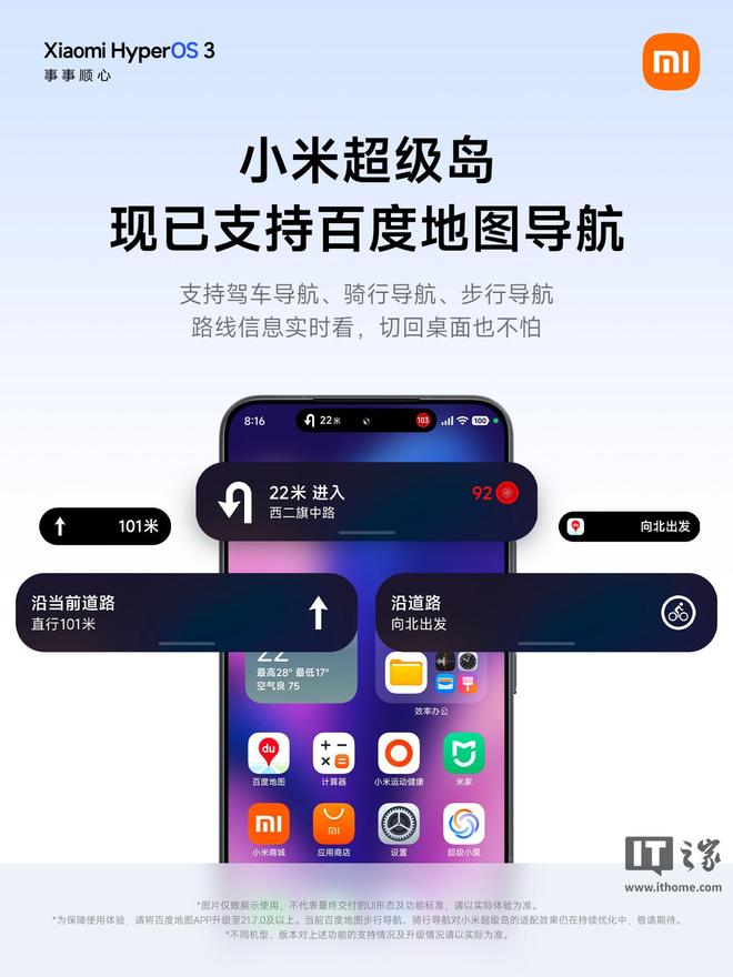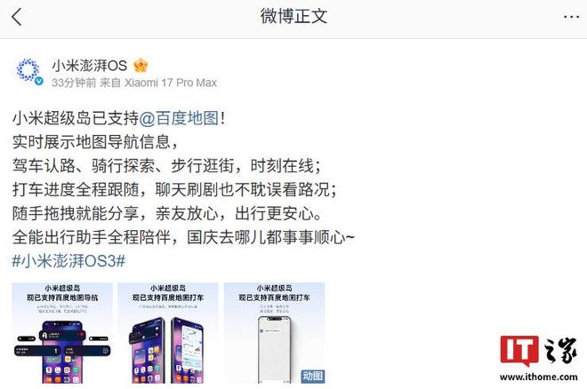 IT之家10月4日消息,小米澎湃OS官方今日宣布,小米超级岛已支持百度地图,可实现实时展示地图导航信息,适配驾车认路、骑行探索、步行逛街等场景;支持百度地图打车,可实现打车进度全程跟随、随手拖拽分享等特性。