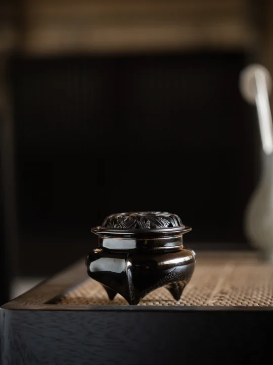 宋代极简美学的当代演绎,黑褐釉色沉稳如山。三足线条利落挺拔,无论是打篆还是空熏,都是空间里最安静的存在。