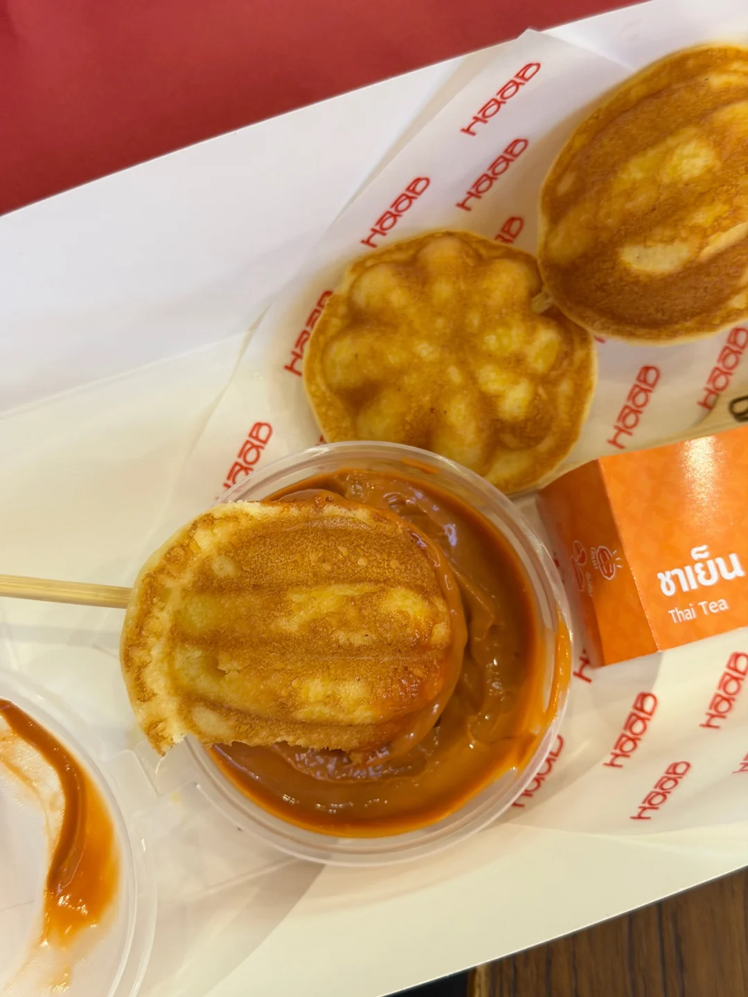 【haab HAAB Bantadthong】 营业时间:15:00-午夜 📍朱拉美食一条街 泰国古早鸡蛋糕 第一次吃是泰国朋友带我来的 后来我每次来朱拉美食街都会来买 口感是外面的边角脆脆的 一口咬下里面的牛油香直接在嘴里蔓延开来 ‼️八种味道选择: 巧克力 抹茶 黑松露 泰茶 椰浆 奶酥 甜蛋丝 奶油味 ‼️四种口味的蘸酱 巧克力 抹茶 泰茶 椰浆 .