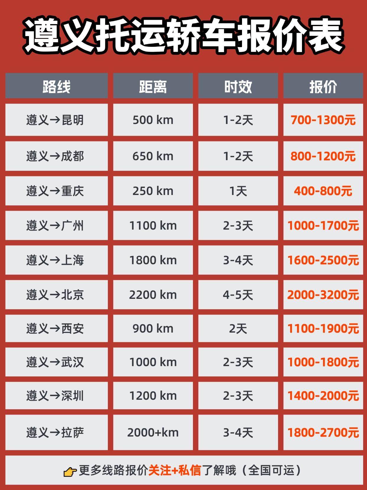 遵义发运全国收费标准💰 报价区间:1300元—5500元(视距离/车型浮动) 时效参考⬇️ ✅ 2000km内:3-4天直达 ✅ 2000km+:5-8天(中转需加时) 板车如何装卸车?🔧 专业工具:液压升降台+固定带 司机配合:挪车入位,无需车主操作 多层防护:轮胎绑带+防滑垫,0剐蹭风险! ⚠️全程录像交接,划痕当场理赔! 🤔 代驾 vs 托运,哪个更安全? 结论很明确:长途运输,尤其是超过1000公里,汽车托运在安全性上优势明显。 •托运:车辆熄火在板车上,不增加里程,磨损小。正规公司会为每辆车购买独立运输保险,全程有监控可追踪。主要风险点在于装卸时的操作,但专业公司都能很好规避。 •代驾:车辆需实际长途行驶,增加发动机、轮胎等部件磨损和里程数。更依赖司机个人技术、状态和路况,存在疲劳驾驶、驾驶习惯差异等不确定风险。 🌟小贴士 砍价秘籍:淡季(3-5月)下单省300+! 避坑必问:报价是否含税/保险?中转几次? 禁运物品:后备箱勿放燃油/锂电池!