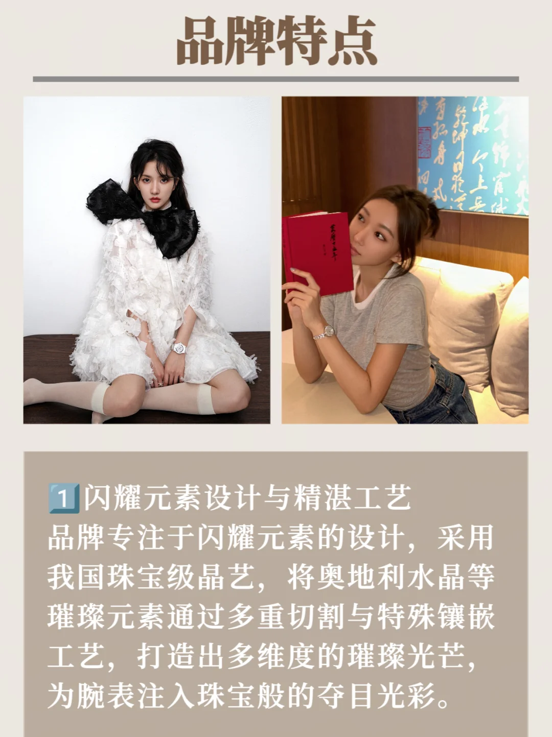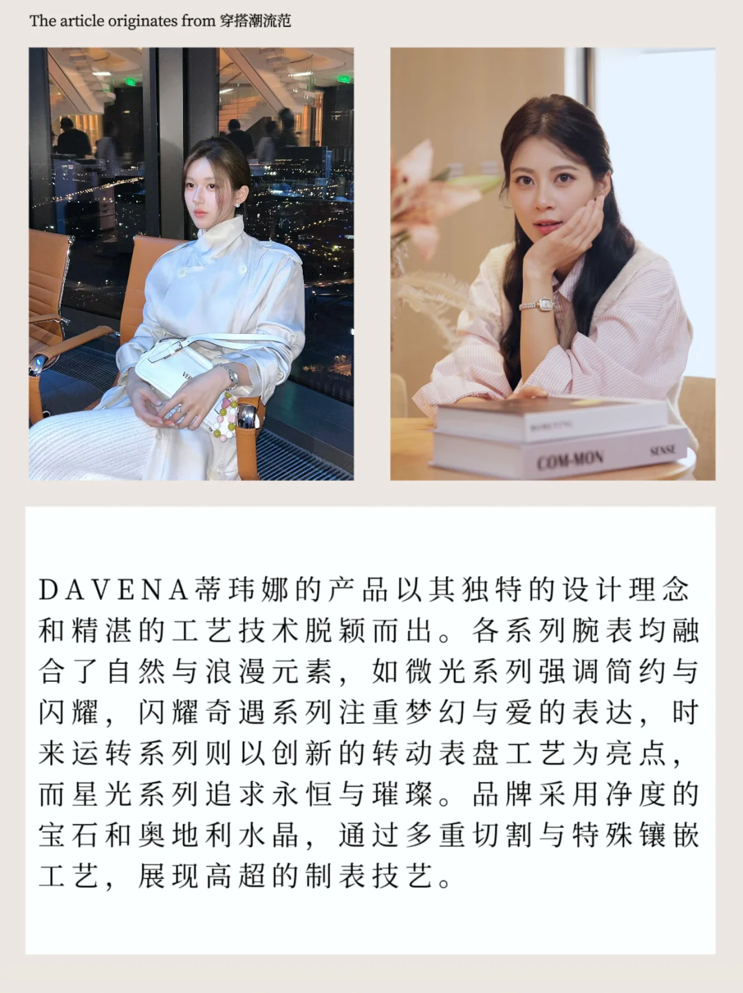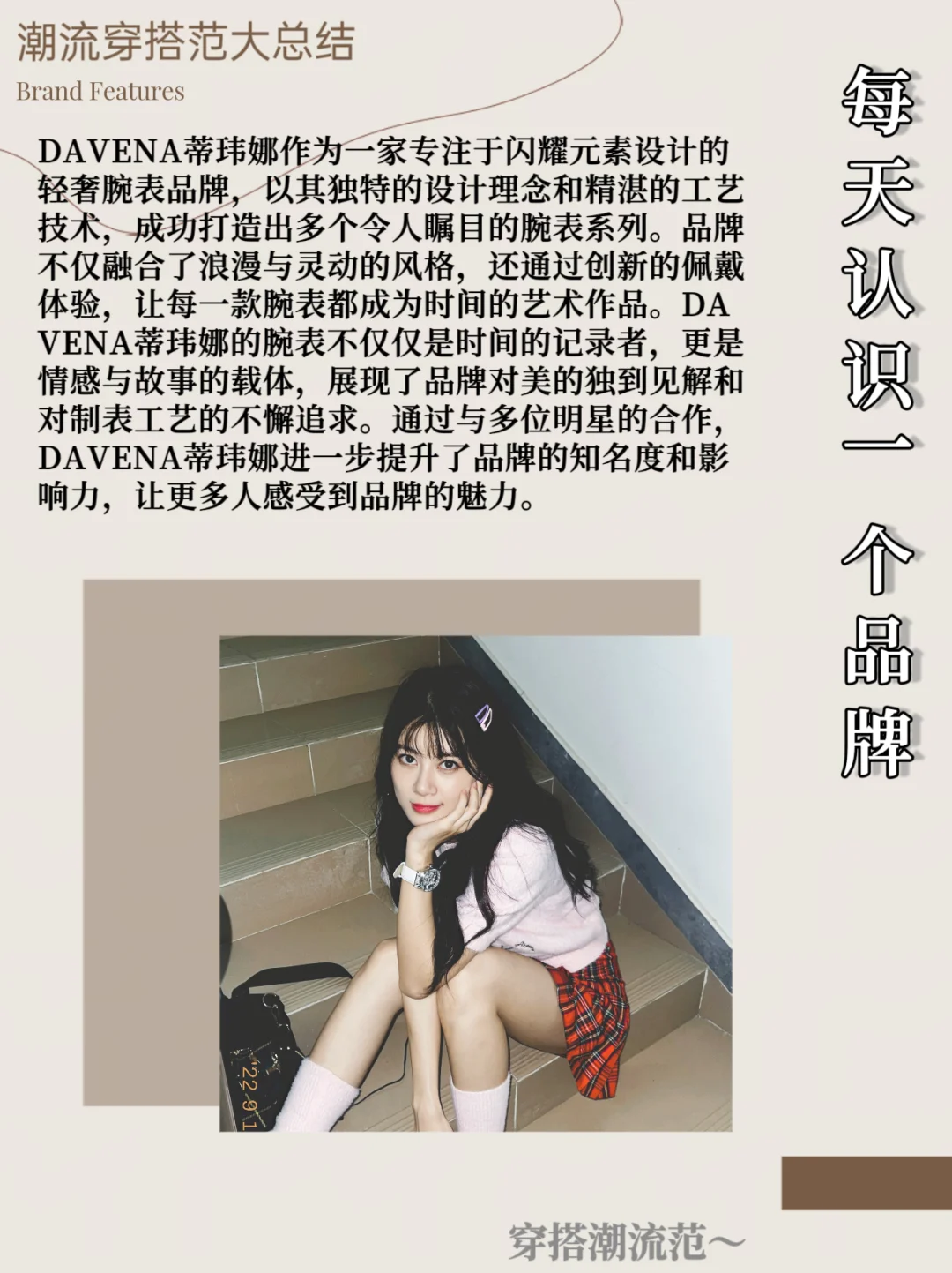 DAVENA蒂玮娜作为一家专注于闪耀元素设计的轻奢腕表品牌,以其独特的设计理念和精湛的工艺技术,成功打造出多个令人瞩目的腕表系列。品牌不仅融合了浪漫与灵动的风格,还通过创新的佩戴体验,让每一款腕表都成为时间的艺术作品。DAVENA蒂玮娜的腕表不仅仅是时间的记录者,更是情感与故事的载体,展现了品牌对美的独到见解和对制表工艺的不懈追求。通过与多位明星的合作,DAVENA蒂玮娜进一步提升了品牌的知名度和影响力,让更多人感受到品牌的魅力。