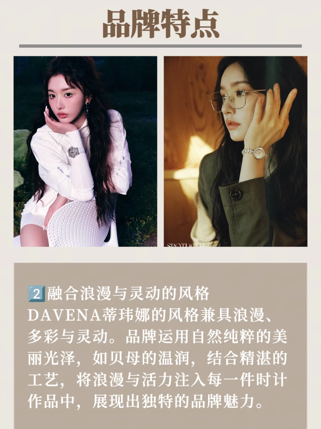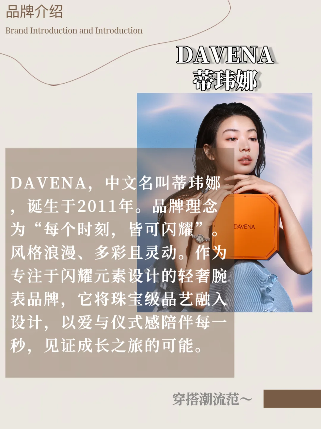 DAVENA,中文名叫蒂玮娜,诞生于2011年。品牌理念为“每个时刻,皆可闪耀”。风格浪漫、多彩且灵动。作为专注于闪耀元素设计的轻奢腕表品牌,它将珠宝级晶艺融入设计,以爱与仪式感陪伴每一秒,见证成长之旅的可能。
