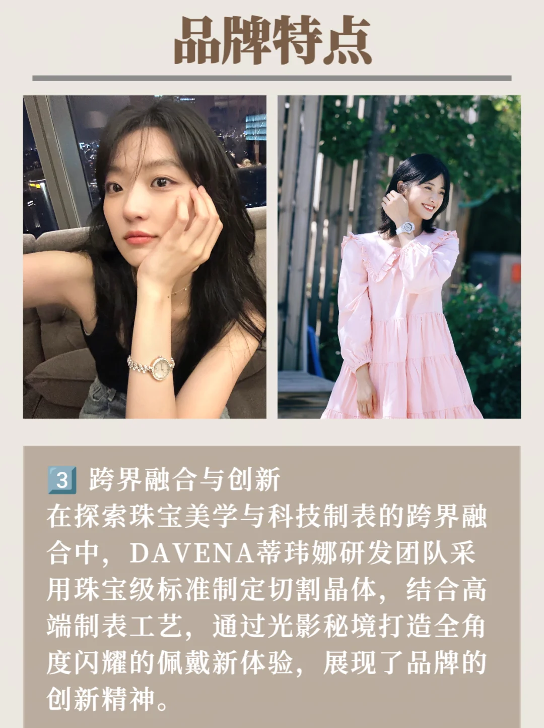DAVENA蒂玮娜的产品以其独特的设计理念和精湛的工艺技术脱颖而出。各系列腕表均融合了自然与浪漫元素,如微光系列强调简约与闪耀,闪耀奇遇系列注重梦幻与爱的表达,时来运转系列则以创新的转动表盘工艺为亮点,而星光系列追求永恒与璀璨。品牌采用净度的宝石和奥地利水晶,通过多重切割与特殊镶嵌工艺,展现高超的制表技艺。
