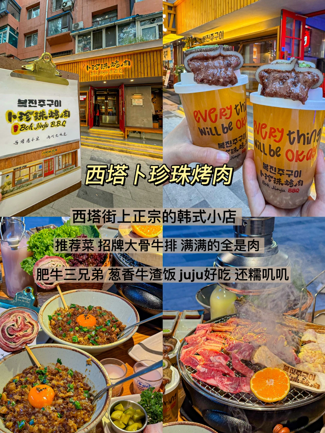 西塔街上正宗的韩国烤肉店 推荐菜品 招牌大骨牛排 满满的全是肉 肥牛三兄弟 葱香牛渣饭 jujuju好吃 还有好吃的糯叽叽