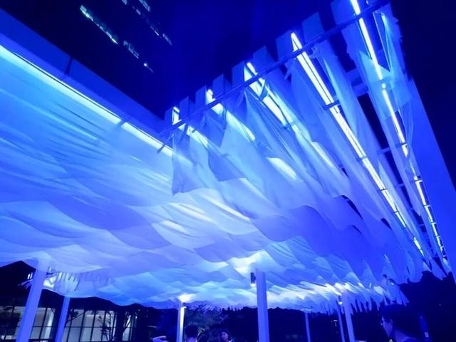 “星幻之境”旁,飘动的纱幔和柔和的彩色灯光随机舞动,唤醒人们对普陀老纺织厂的记忆,体现沪西纺织工业的历史底蕴,让人们在光与影中回顾历史,品味人生。