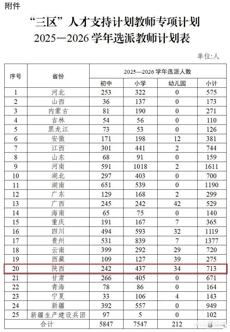 陕西713人!2025年“三区”人才支持计划教师专项计划来啦 10月1日,据省教育厅消息:教育部、财政部近日联合印发《关于做好2025年“三区”人才支持计划教师专项计划有关实施工作的通知》(以下简称《通知》)。按照通知,2025—2026学年度全国计划选派13606名教师到“三区”(边远贫困地区、边疆民族地区和革命老区)支教,其中陕西计划选派713名(初中242名、小学437名、幼儿园34名)。 省教育厅相关负责人表示,《通知》进一步强调要完善政策与经费保障,确保支教教师安心从教、热心从教。选派到“三区”的支教教师,支教期间人事关系保留在原单位,支教期满后仍回原单位工作。原工资福利待遇不变,按月发放工作补助、交通差旅费用等补助。其支教经历视同城镇教师到农村教育工作经历。受援县义务教育阶段教师选派工作经费由中央财政和地方财政按照年人均2万元标准共同分担。