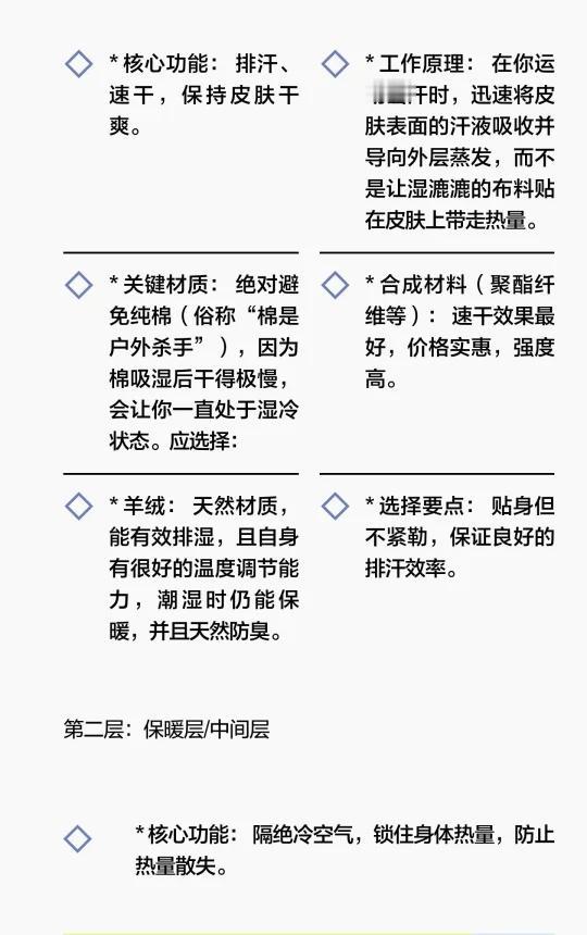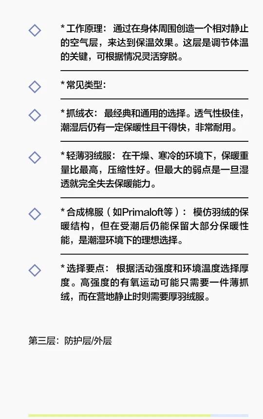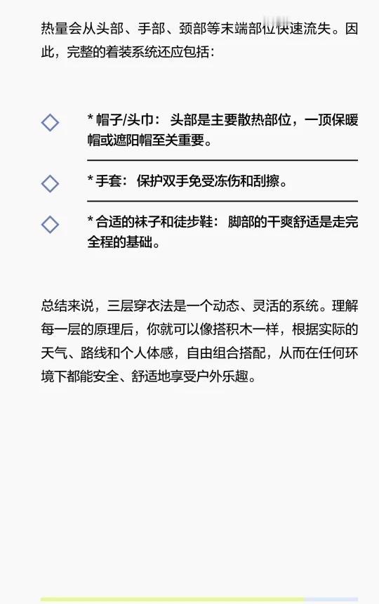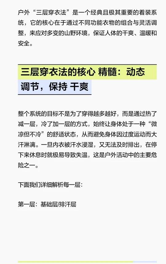 秋日温差大,赏秋徒步推荐三层穿衣法 户外“三层穿衣法”通过基础层排汗、保暖层隔温、防护层防风,动态调节体温,保持干爽。选择材质如合成纤维、羊绒,确保透气性。配件如帽子、手套、袜子和鞋同样重要,确保头部、手部、脚部和头部的干爽。 徒步圈 户外徒步 徒步丈量世界 注意防寒保暖 三层穿衣法则 户外保暖层 徒步赏秋好去处 今日户外小知识 冬季户外活动
