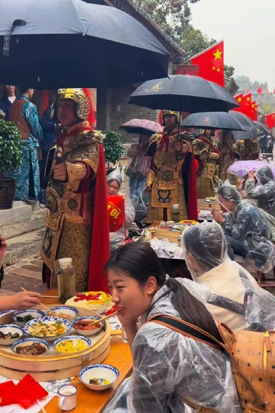 感觉不吃要被杀头的感觉,这顿饭不吃也罢,说不出来的心酸,吃完好上路! 这种金色盔甲,应该是御林军吧,守卫皇宫的。大唐雄风,曾经打败过突厥人的大唐铁骑,士兵和军人一样,让他们打伞坐在那里吃饭,还真吃不下一点不好玩。乱世将军,盛世就是给别人打伞的? 弄一个固定的遮阳伞,晴天防晒,雨天防水多好呀,“士兵”往后面一站,那才是将军出征谋士相伴的场面。 打伞的:小样儿,看你吃不吃。 食客:吃, 我吃 ,我一定吃。 打伞的:这还差不多。