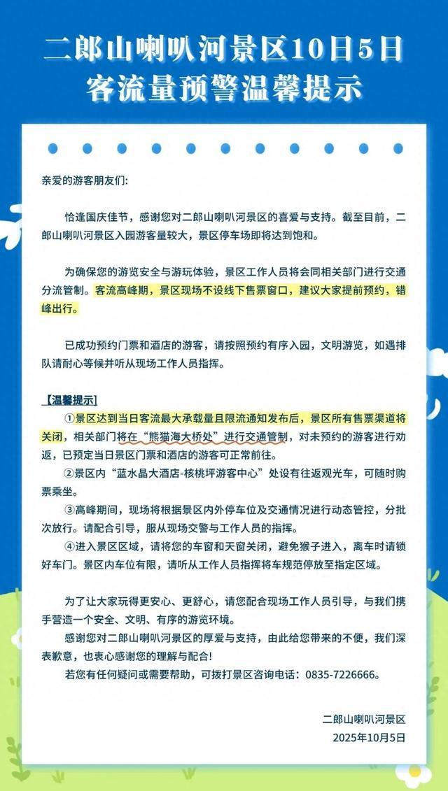 都江堰景区日最大容量为6万人,截至10月5日08点10分,游客购票量已达到最大容量的80%(4.8万人),已启动橙色预警,将立即停止OTA(美团、携程等第三方销售平台)、OTC(旅行社)线上销售渠道售票。都江堰景区当日门票仅保留景区官方微信公众号、窗口、扫码购售票。游客们可实时关注景区售票情况,景区将现场按场内人数进行入园调控,如预警解除,将恢复以上售票渠道。