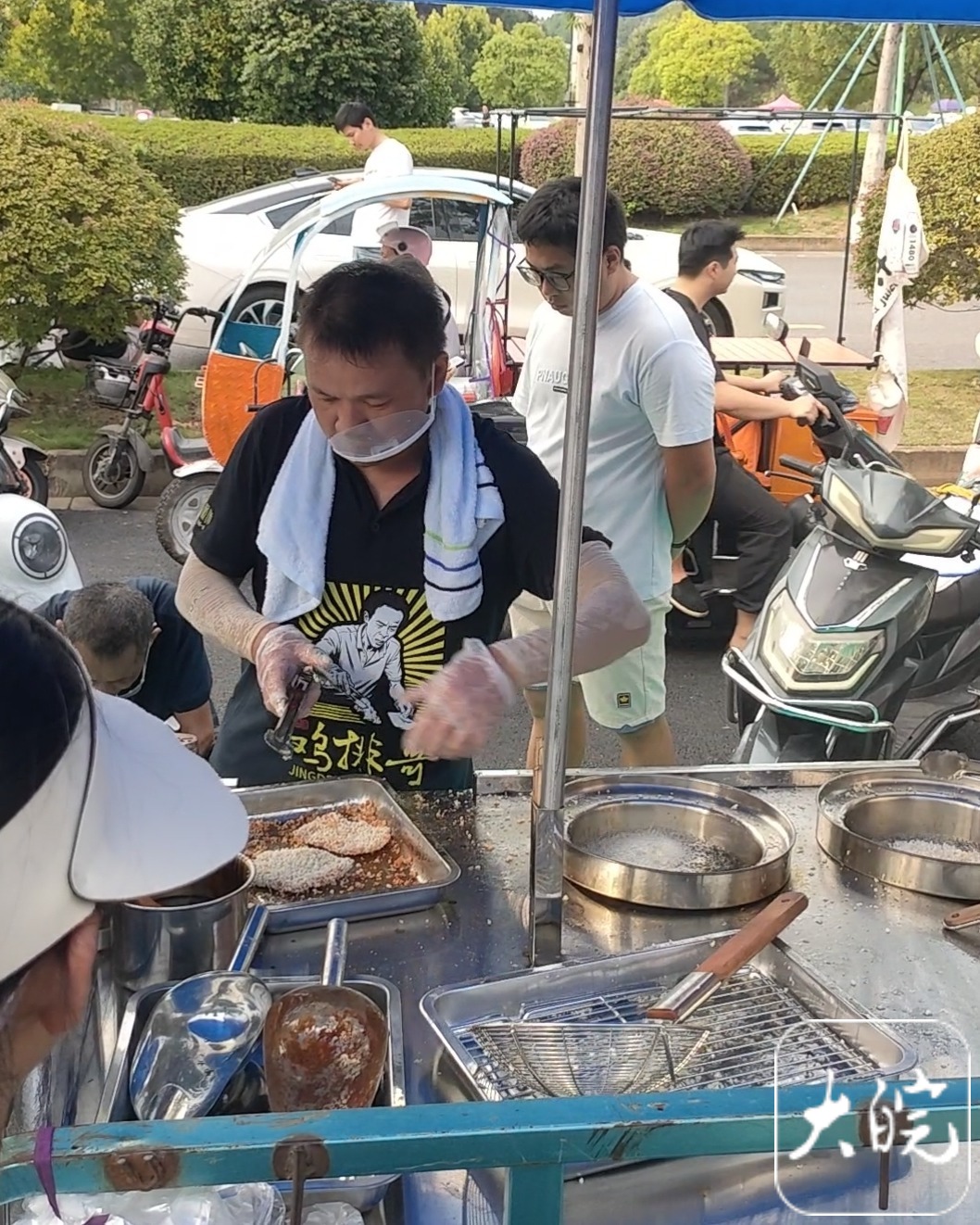 “鸡排家族”成员正在炸鸡排(图片为10月1日下午,大皖新闻记者现场拍摄)。