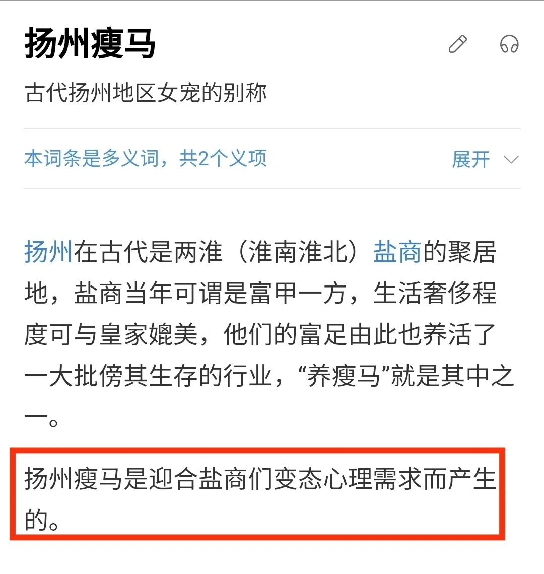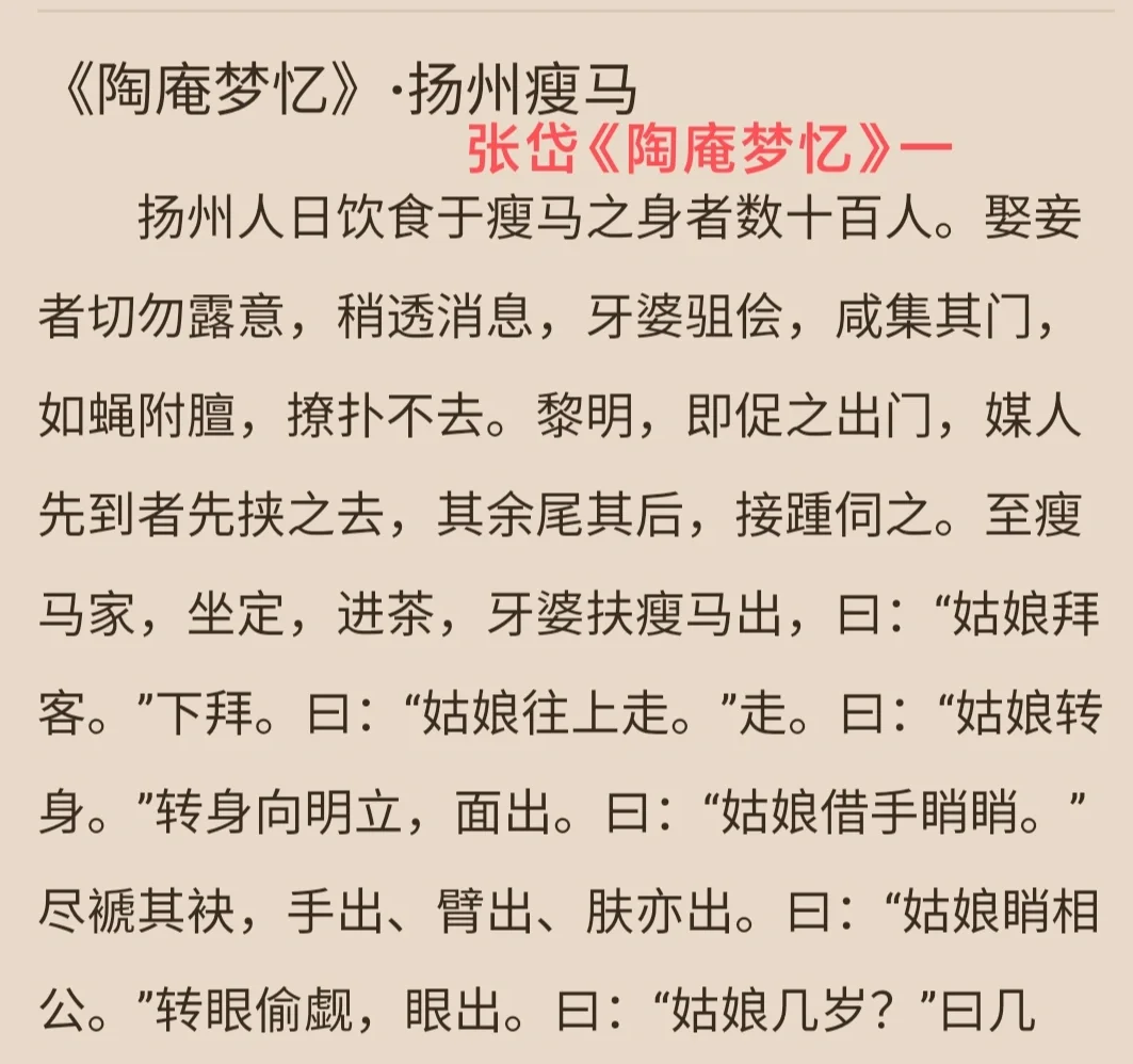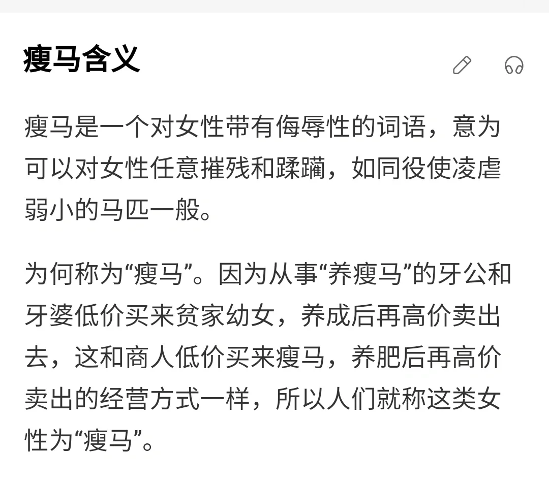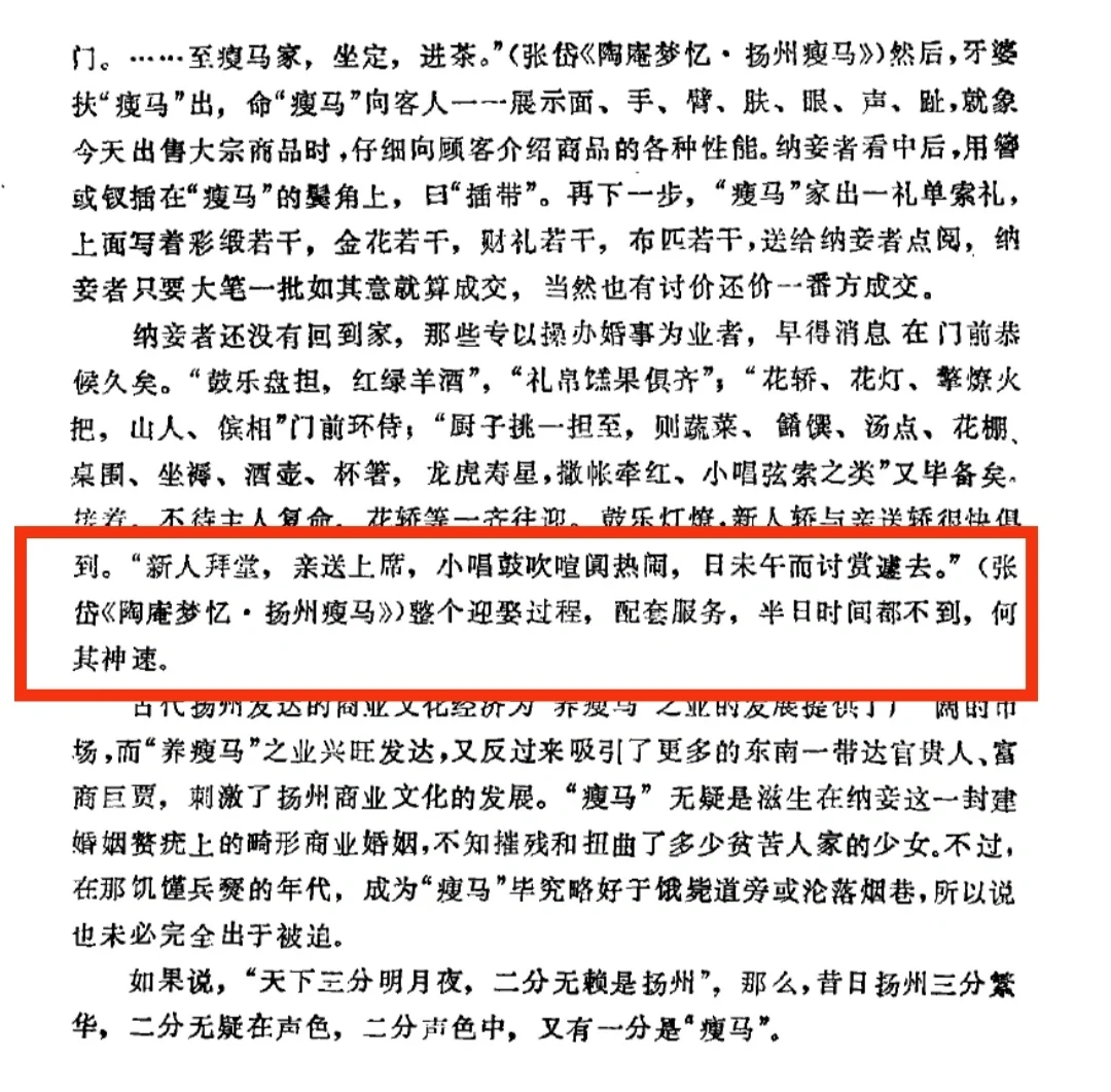 一个人怎么会被称为马呢? ‼️原来扬州在古代是两淮(淮南淮北)盐商的聚居地,盐商当年可谓是富甲一方,生活奢侈程度可与皇家媲美。 扬州瘦马是迎合盐商们变态心理需求而产生的。 ‼️为何称为“瘦马”。因为从事“养瘦马”的牙公和牙婆低价买来贫家幼女,养成后再高价卖出去,这和商人低价买来瘦马,养肥后再高价卖出的经营方式一样,所以人们就称这类女性为“瘦马”。 ‼️看完这一段介绍,心久久不能平静! ‼️古代远不如想象中美好!现代女穿越成神怕只能存在于小说中了……