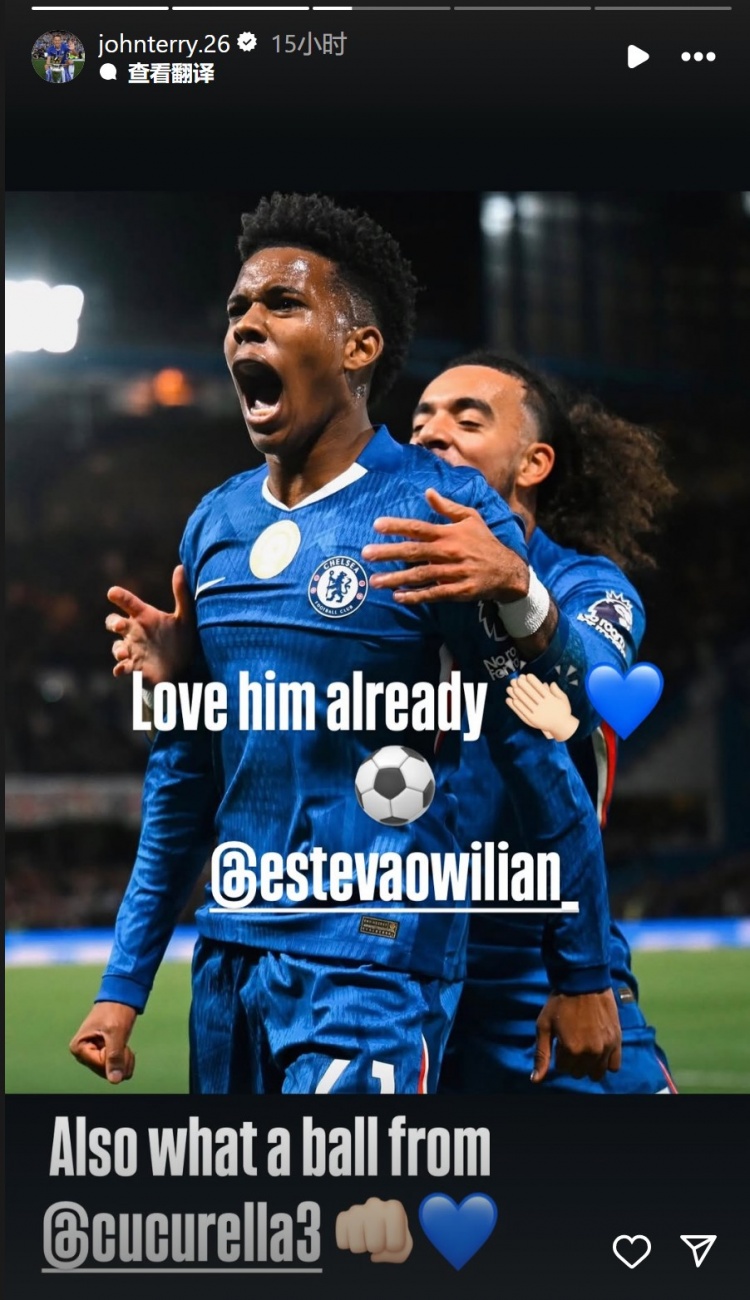 切尔西名宿特里社媒晒出埃斯特旺的照片,配文:“已经爱上他了,库库雷利亚的助攻太精彩了。”